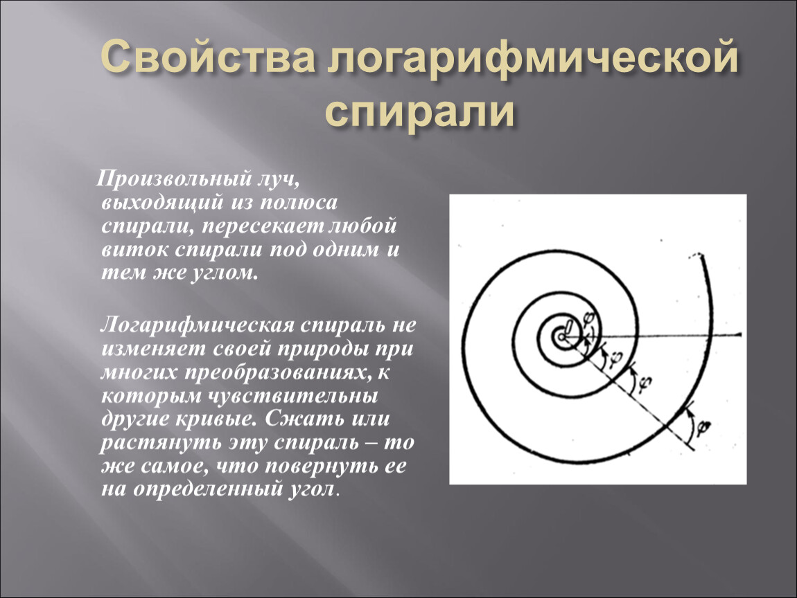 Логарифмическая спираль не изменяет своей природы при многих преобразованиях, к которым чувствительны другие кривые. Сжать или растянуть эту спираль – то же самое, что повернуть ее на определенный угол.