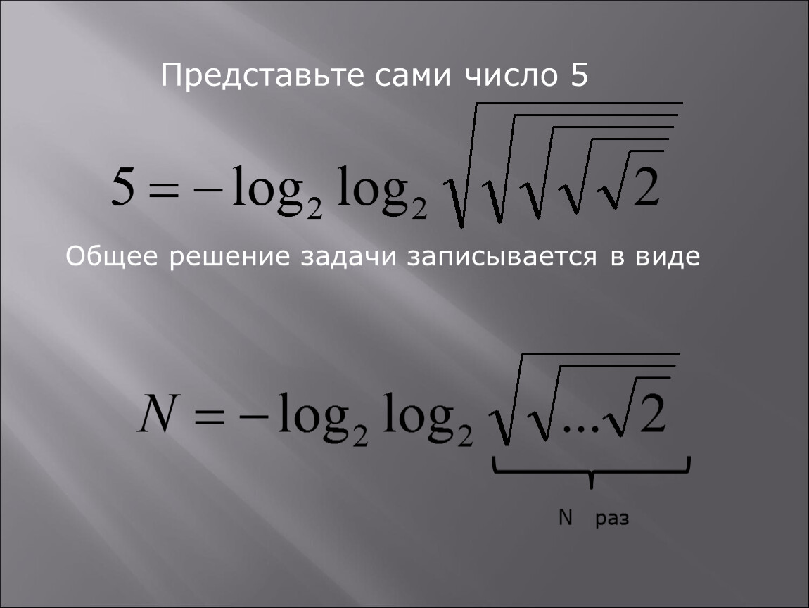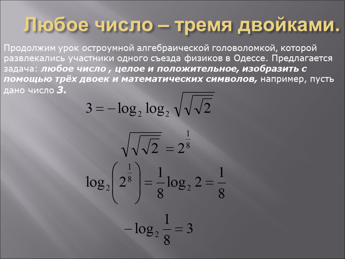 Продолжим урок остроумной алгебраической головоломкой, которой развлекались участники одного съезда физиков в Одессе. Предлагается задача: любое число , целое и положительное, изобразить с помощью трёх двоек и математических символов, например, пусть дано число 3.