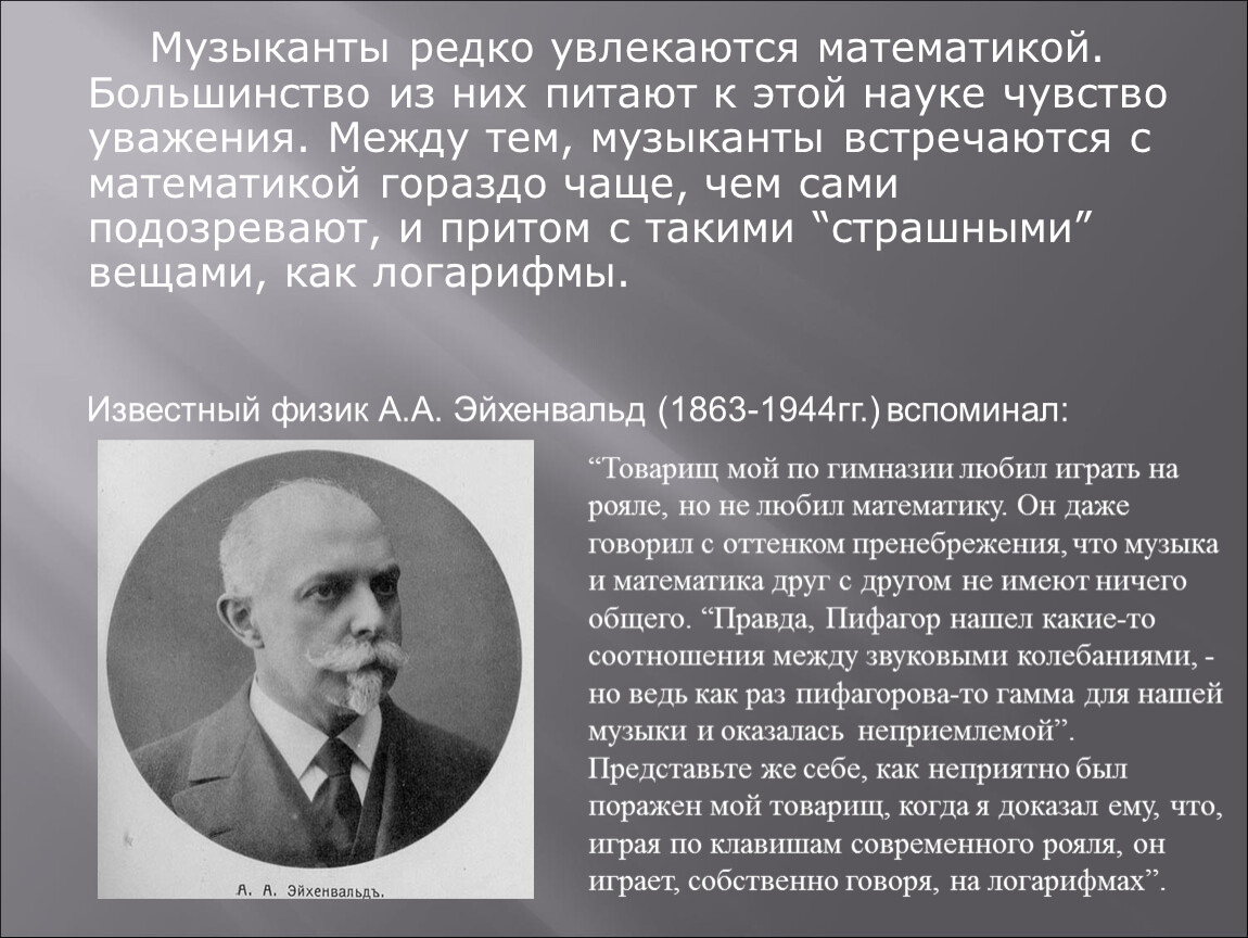 “Товарищ мой по гимназии любил играть на рояле, но не любил математику. Он даже говорил с оттенком пренебрежения, что музыка и математика друг с другом не имеют ничего общего. “Правда, Пифагор нашел какие-то соотношения между звуковыми колебаниями, - но ведь как раз пифагорова-то гамма для нашей музыки и оказалась неприемлемой”. Представьте же себе, как неприятно был поражен мой товарищ, когда я доказал ему, что, играя по клавишам современного рояля, он играет, собственно говоря, на логарифмах”.