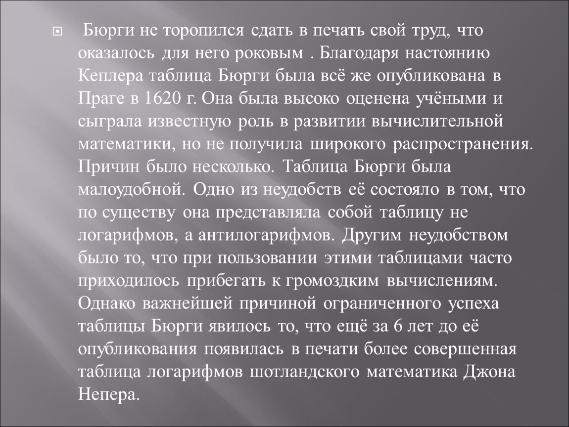Бюрги не торопился сдать в печать свой труд, что оказалось для него роковым . Благодаря настоянию Кеплера таблица Бюрги была всё же опубликована в Праге в 1620 г. Она была высоко оценена учёными и сыграла известную роль в развитии вычислительной математики, но не получила широкого распространения. Причин было несколько. Таблица Бюрги была малоудобной. Одно из неудобств её состояло в том, что по существу она представляла собой таблицу не логарифмов, а антилогарифмов. Другим неудобством было то, что при пользовании этими таблицами часто приходилось прибегать к громоздким вычислениям. Однако важнейшей причиной ограниченного успеха таблицы Бюрги явилось то, что ещё за 6 лет до её опубликования появилась в печати более совершенная таблица логарифмов шотландского математика Джона Непера.