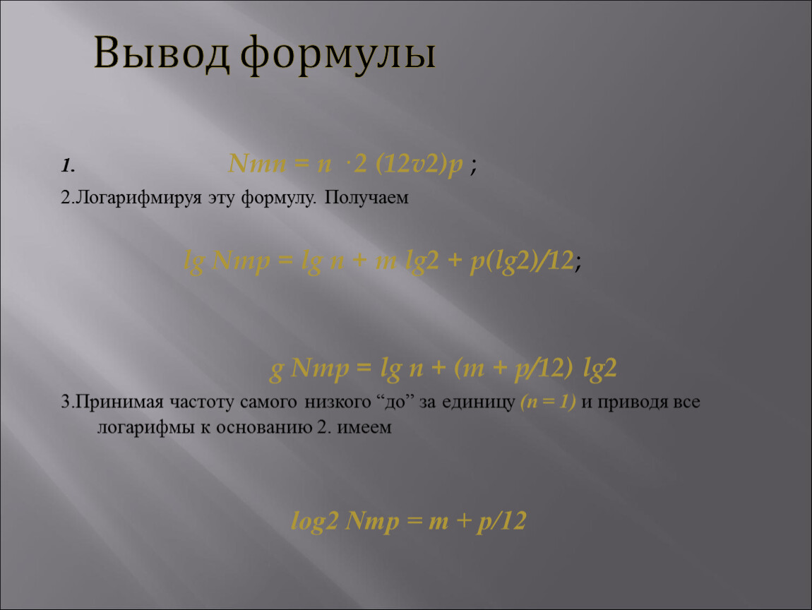 Положим, что ноте “до” самой низкой октавы – будем ее называть нулевой – соответствует частота, равная n колебаниям в секунду. В октаве частота колебаний нижнего звука в 2 раза меньше верхнего, т.е. эти частоты соотносятся как 1 : 2. Тогда ноте “до” первой октавы будут соответствовать 2n колебания в сек., а ноте “до” третьей октавы - 2m · n колебания в сек. И т.д.. Тогда высоту, т.е. частоту любого звука можно выразить формулой!