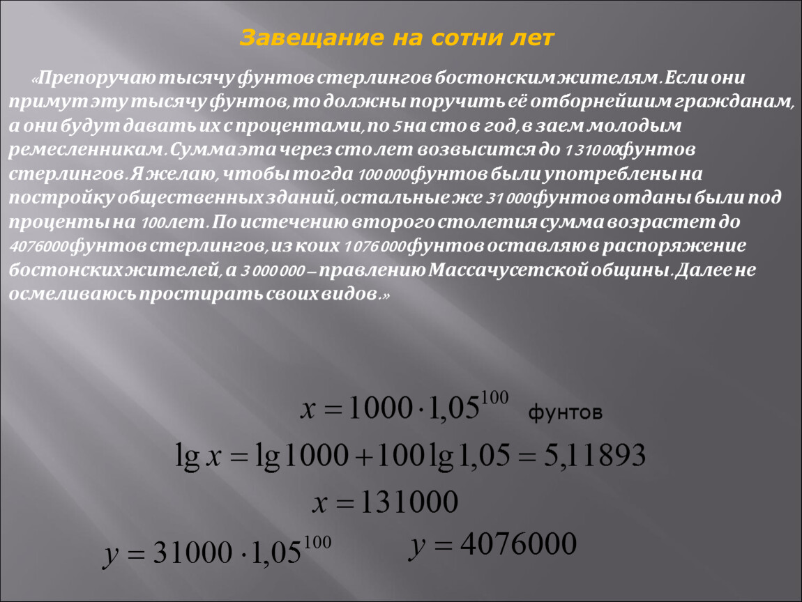 «Препоручаю тысячу фунтов стерлингов бостонским жителям. Если они примут эту тысячу фунтов, то должны поручить её отборнейшим гражданам, а они будут давать их с процентами, по 5 на сто в год, в заем молодым ремесленникам. Сумма эта через сто лет возвысится до 1 310 00фунтов стерлингов. Я желаю, чтобы тогда 100 000 фунтов были употреблены на постройку общественных зданий, остальные же 31 000 фунтов отданы были под проценты на 100 лет. По истечению второго столетия сумма возрастет до 4076000 фунтов стерлингов, из коих 1 076 000 фунтов оставляю в распоряжение бостонских жителей, а 3 000 000 – правлению Массачусетской общины. Далее не осмеливаюсь простирать своих видов.»