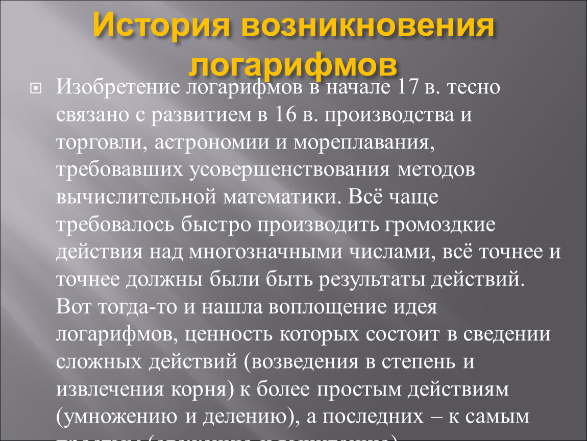 Изобретение логарифмов в начале 17 в. тесно связано с развитием в 16 в. производства и торговли, астрономии и мореплавания, требовавших усовершенствования методов вычислительной математики. Всё чаще требовалось быстро производить громоздкие действия над многозначными числами, всё точнее и точнее должны были быть результаты действий. Вот тогда-то и нашла воплощение идея логарифмов, ценность которых состоит в сведении сложных действий (возведения в степень и извлечения корня) к более простым действиям (умножению и делению), а последних – к самым простым (сложению и вычитанию).
