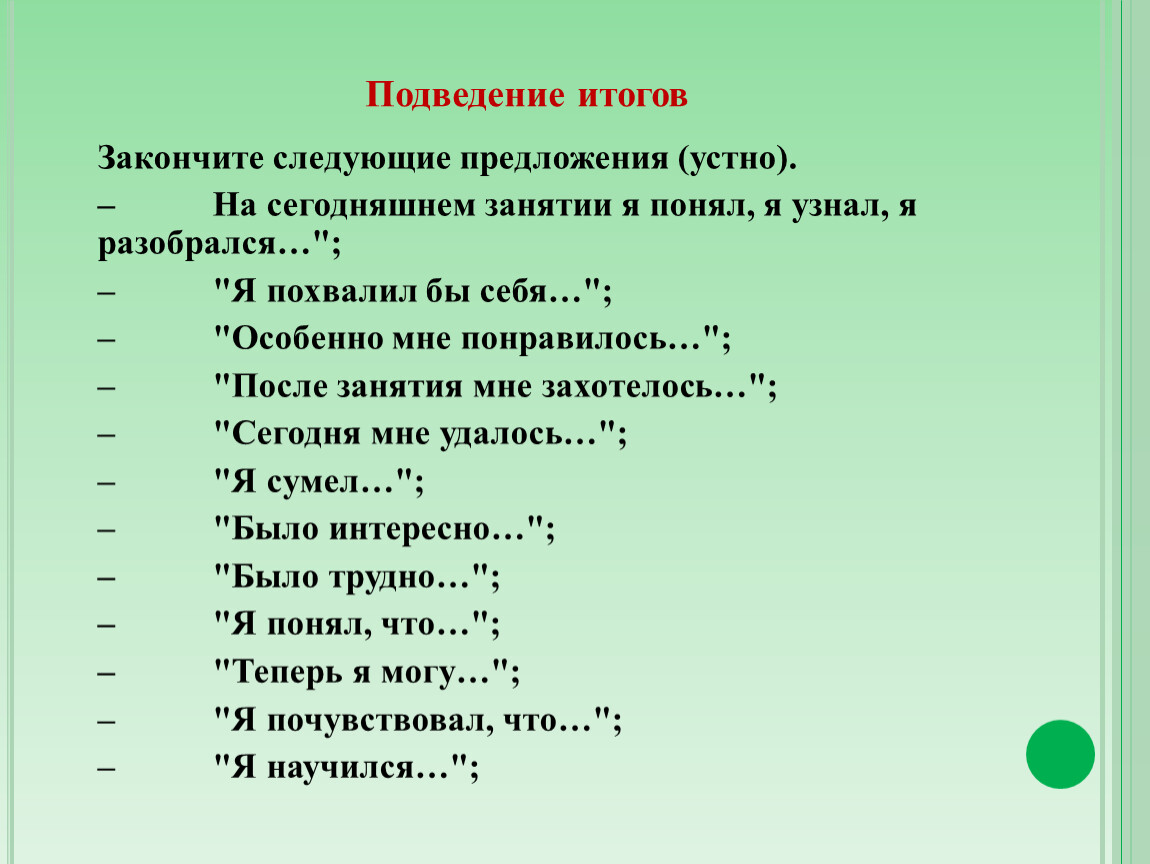 – На сегодняшнем занятии я понял, я узнал, я разобрался…";