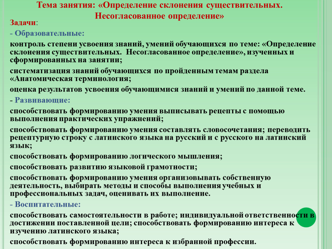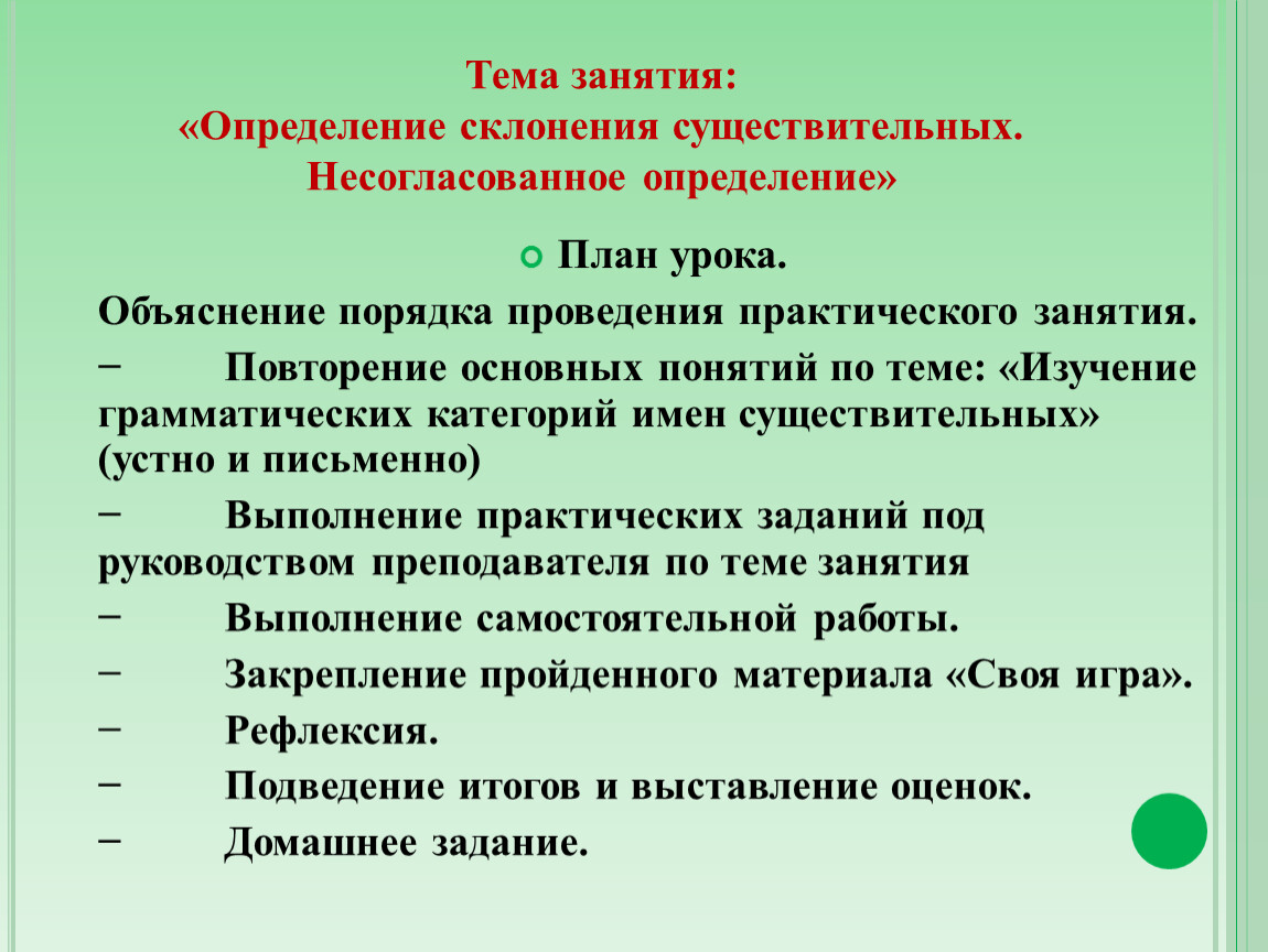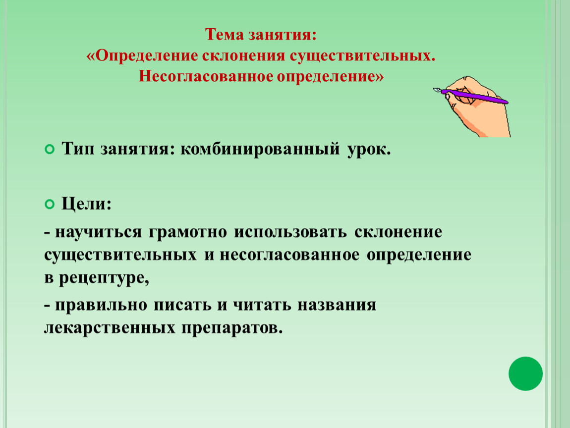 Тема занятия: «Определение склонения существительных. Несогласованное определение»