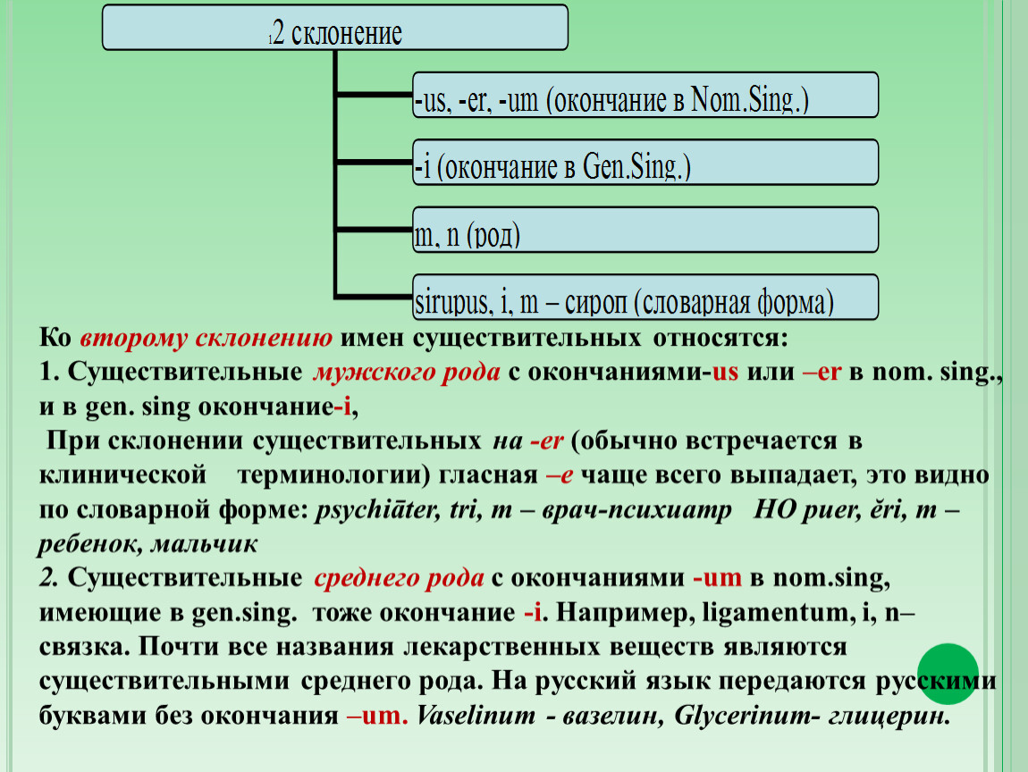 2. Существительные среднего рода с окончаниями -um в nom.sing, имеющие в gen.sing. тоже окончание -i. Например, ligamentum, i, n–связка. Почти все названия лекарственных веществ являются существительными среднего рода. На русский язык передаются русскими буквами без окончания –um. Vaselinum - вазелин, Glycerinum- глицерин.