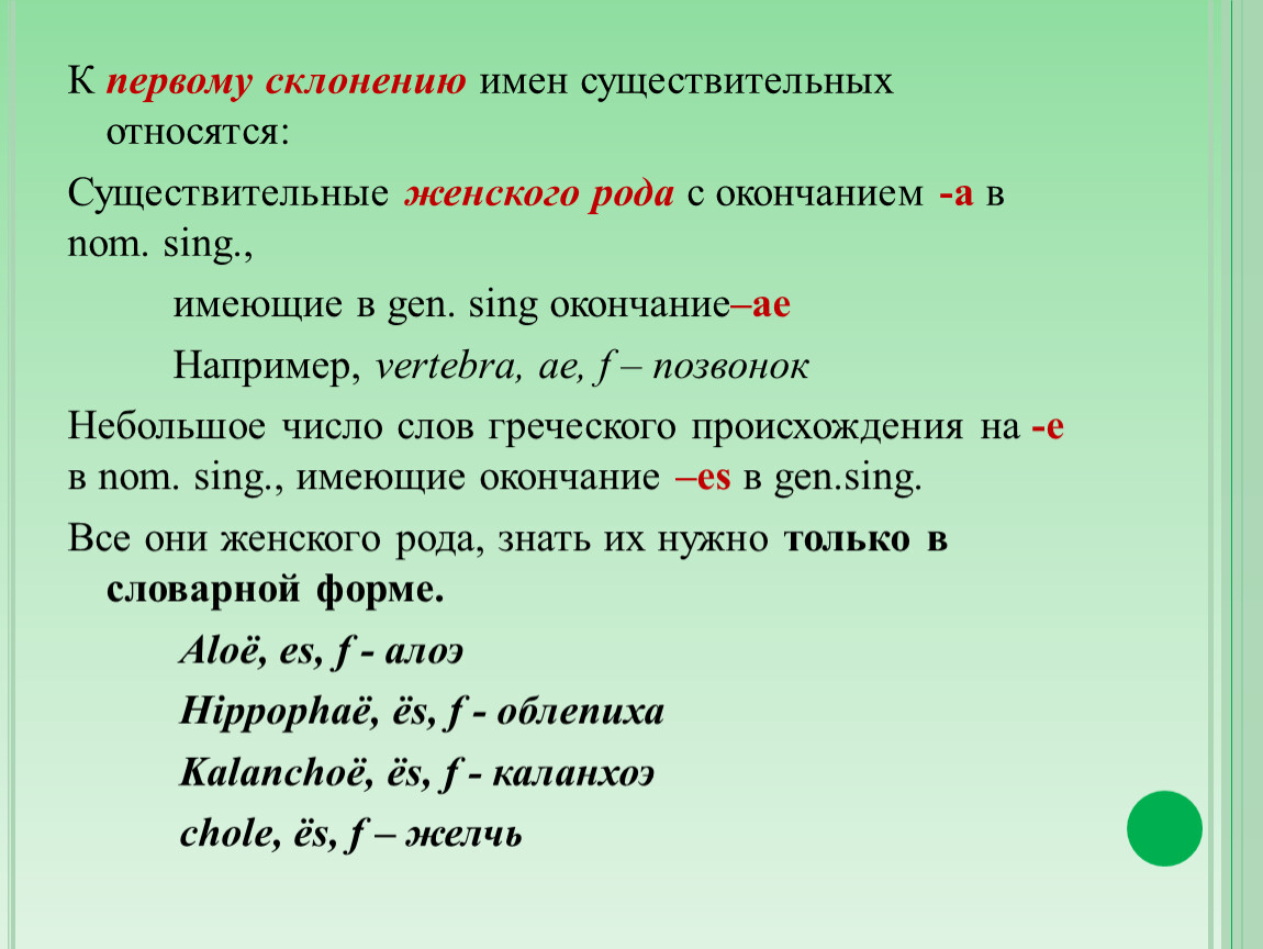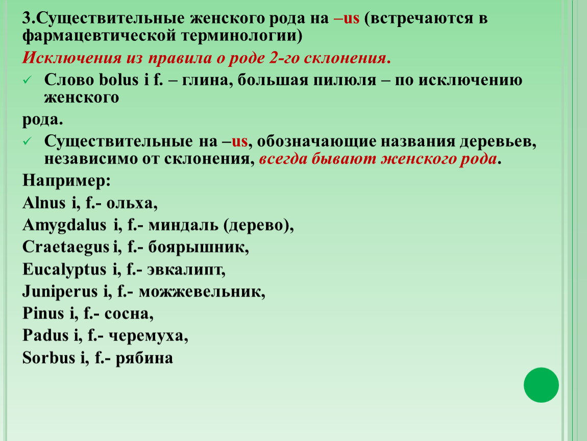 bolus, i, f – глина, crystallus, i, f–кристалл, Alnus, i, f – ольха, Eucalyptus, i, f– эвкалипт, Juniperus, i, f – можжевельник