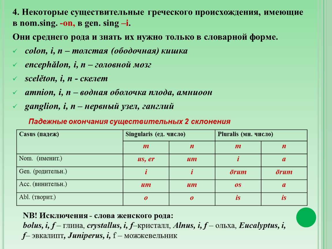4. Некоторые существительные греческого происхождения, имеющие в nom.sing. -on, в gen. sing –i.