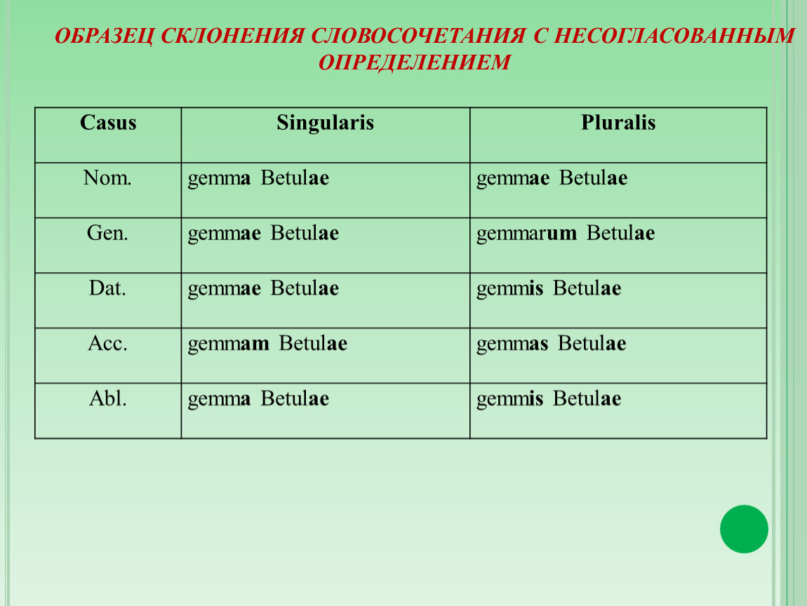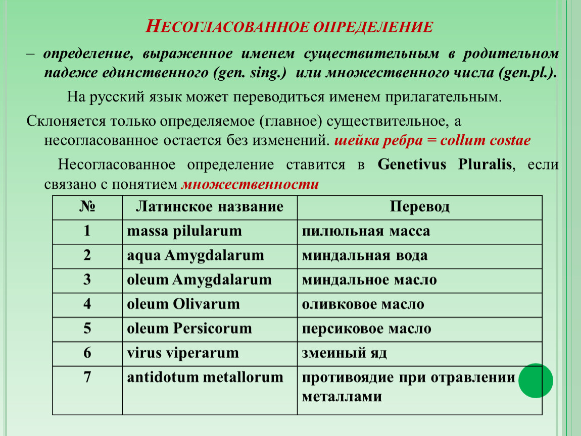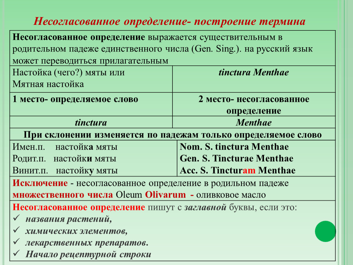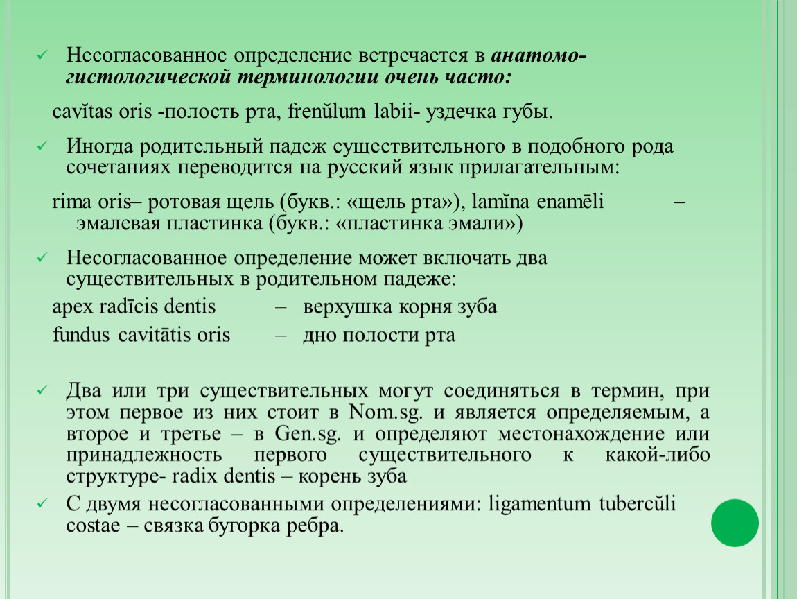 Два или три существительных могут соединяться в термин, при этом первое из них стоит в Nom.sg. и является определяемым, а второе и третье – в Gen.sg. и определяют местонахождение или принадлежность первого существительного к какой-либо структуре- radix dentis – корень зуба