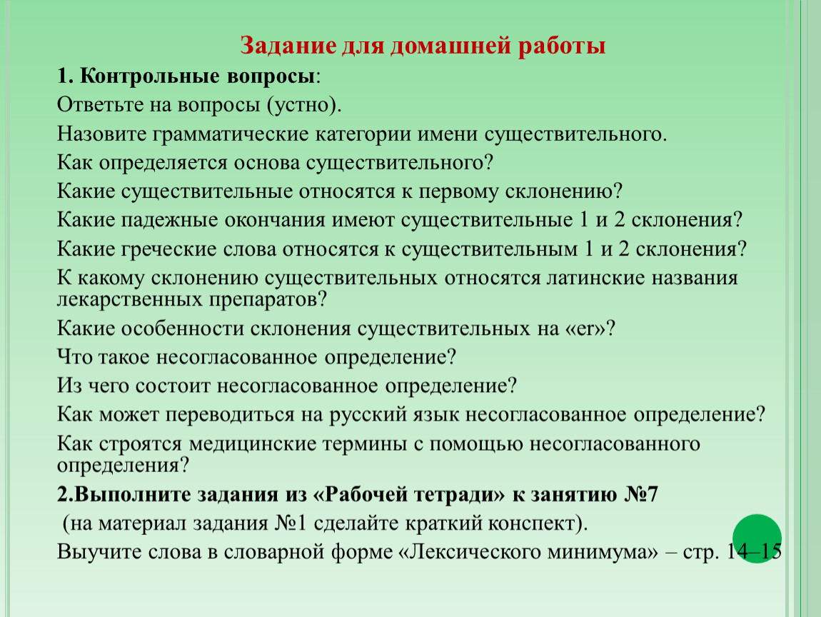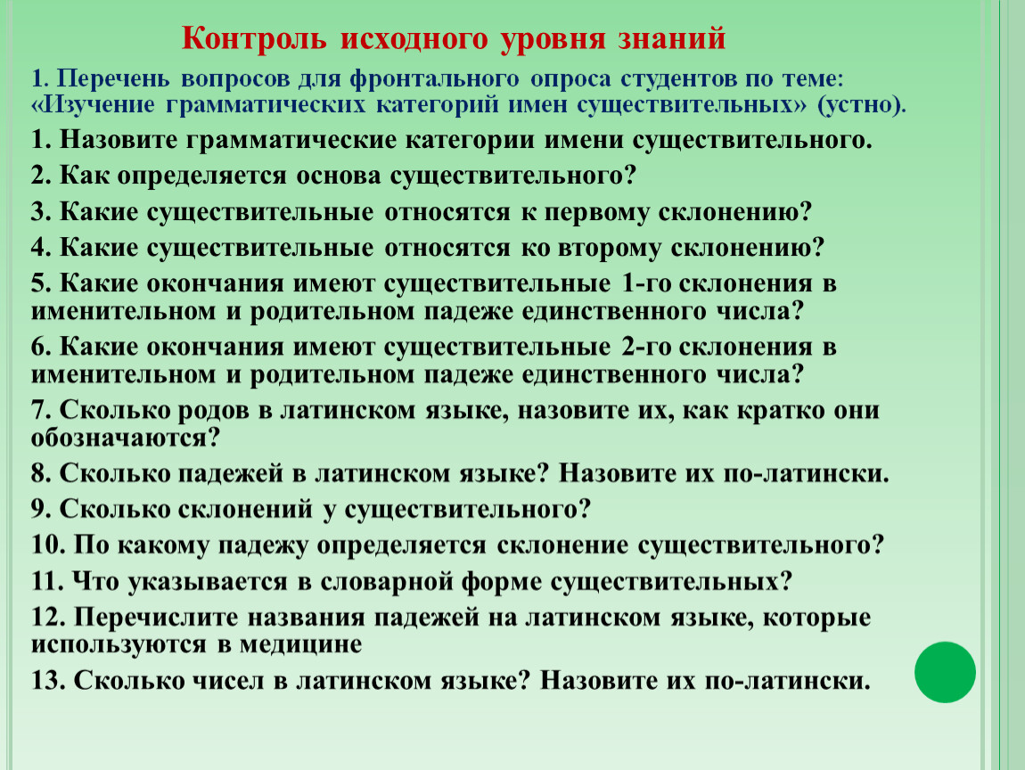 1. Перечень вопросов для фронтального опроса студентов по теме: «Изучение грамматических категорий имен существительных» (устно).