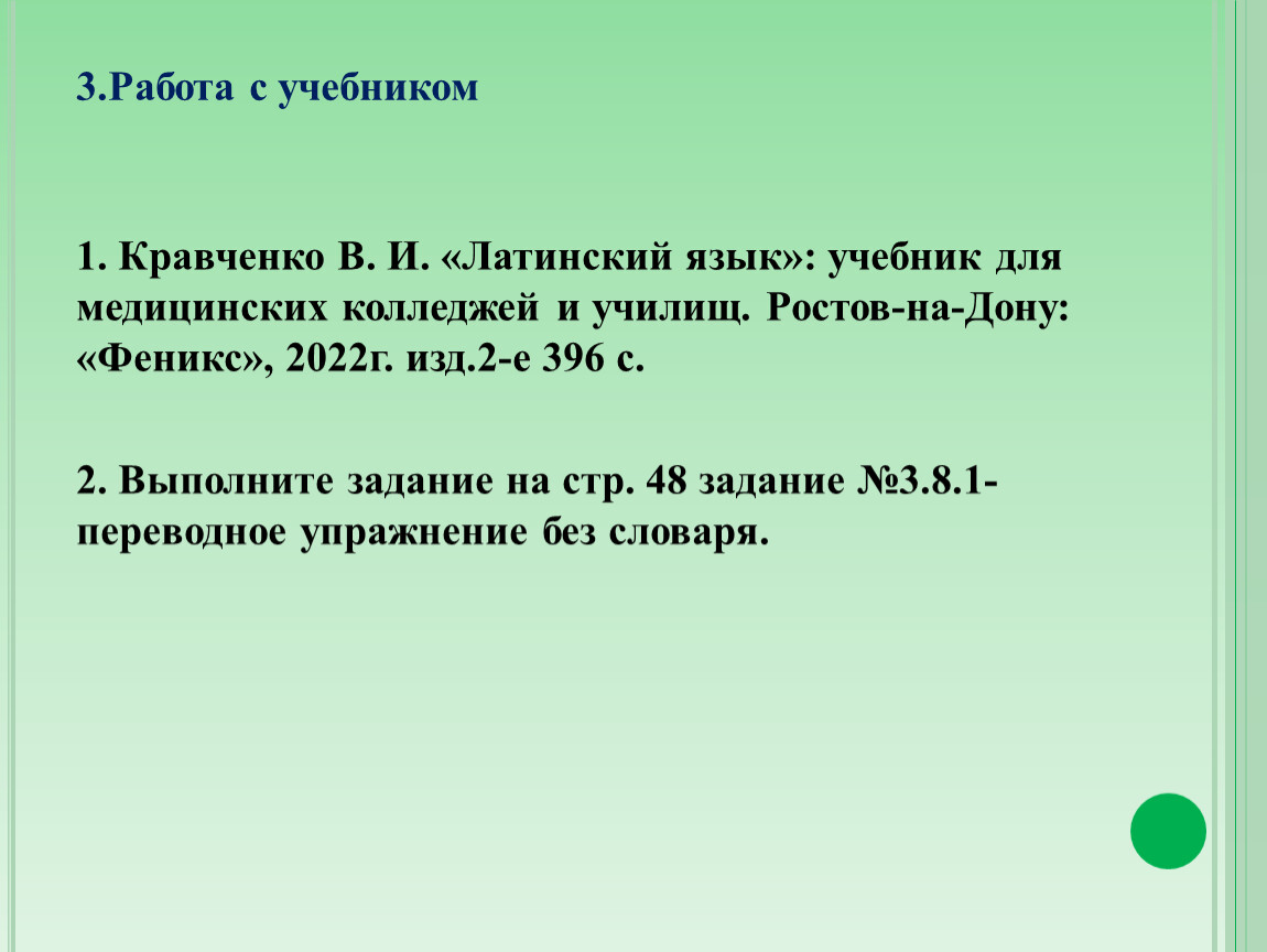 1. Кравченко В. И. «Латинский язык»: учебник для медицинских колледжей и училищ. Ростов-на-Дону: «Феникс», 2022г. изд.2-е 396 с.
