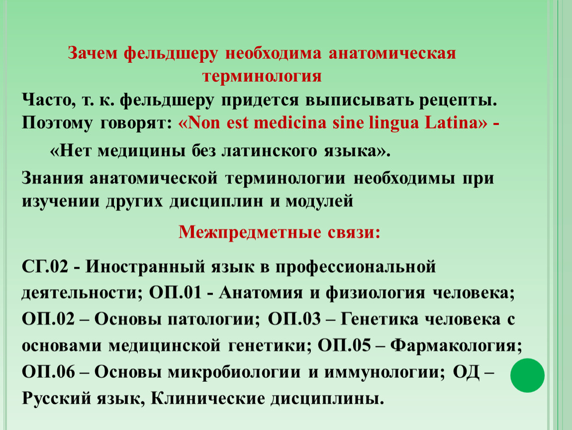 Знания анатомической терминологии необходимы при изучении других дисциплин и модулей