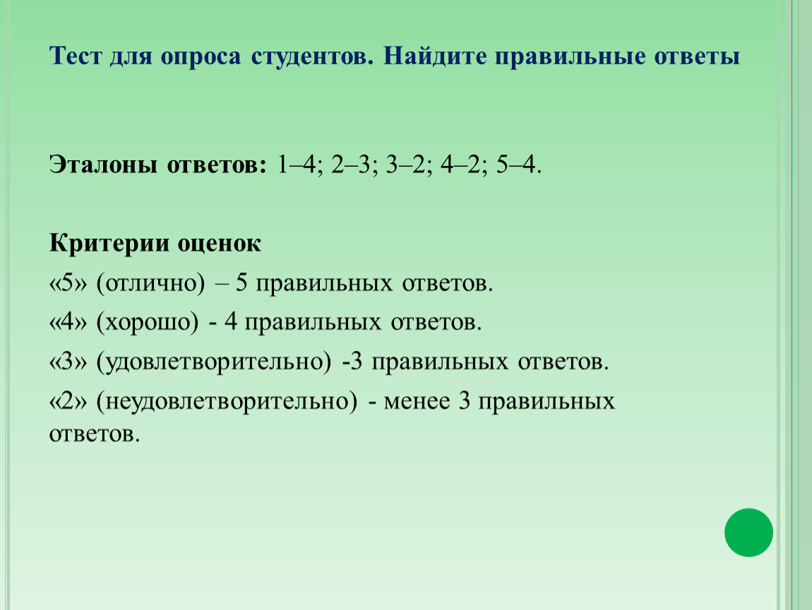 Эталоны ответов: 1–4; 2–3; 3–2; 4–2; 5–4.