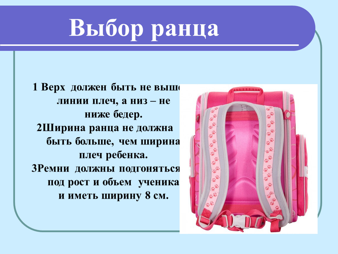 - Школьный ранец должен плотно прилегать к обоим плечам и оканчиваться у костей таза.