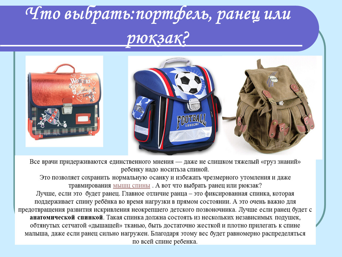3 Узнать как правильно выбрать портфель и каким гигиеническим нормативам он должен соответствовать.