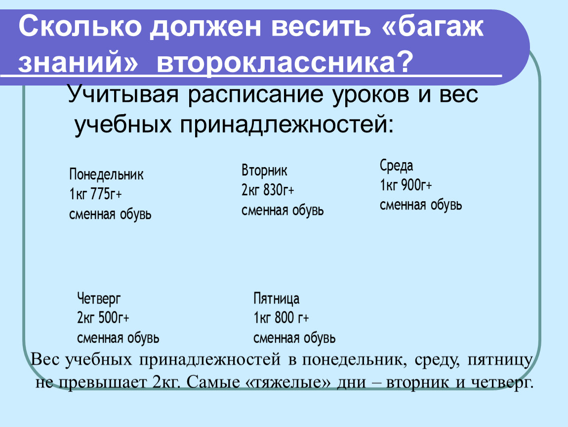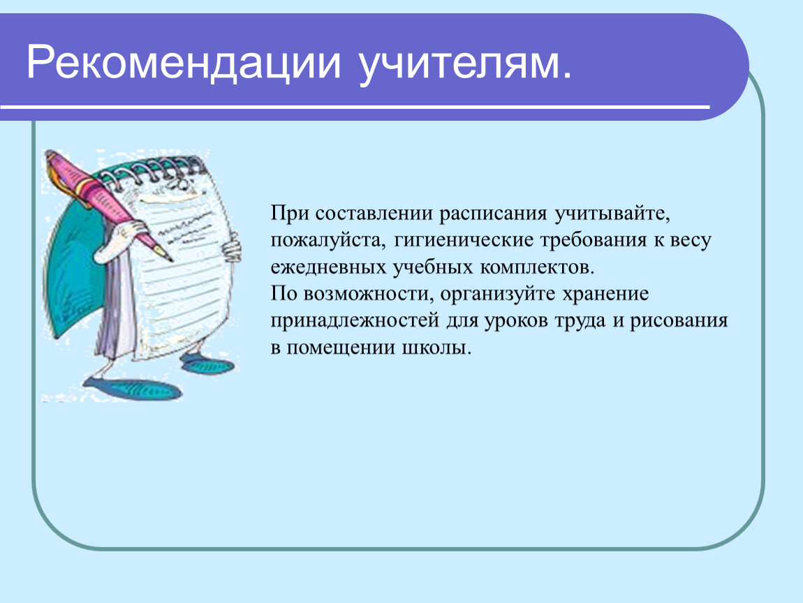 При составлении расписания учитывайте, пожалуйста, гигиенические требования к весу ежедневных учебных комплектов.