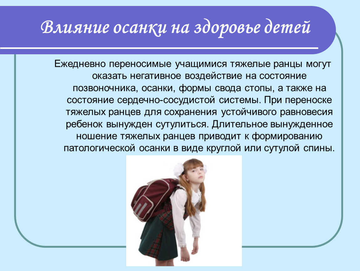 Ежедневно переносимые учащимися тяжелые ранцы могут оказать негативное воздействие на состояние позвоночника, осанки, формы свода стопы, а также на состояние сердечно-сосудистой системы. При переноске тяжелых ранцев для сохранения устойчивого равновесия ребенок вынужден сутулиться. Длительное вынужденное ношение тяжелых ранцев приводит к формированию патологической осанки в виде круглой или сутулой спины.