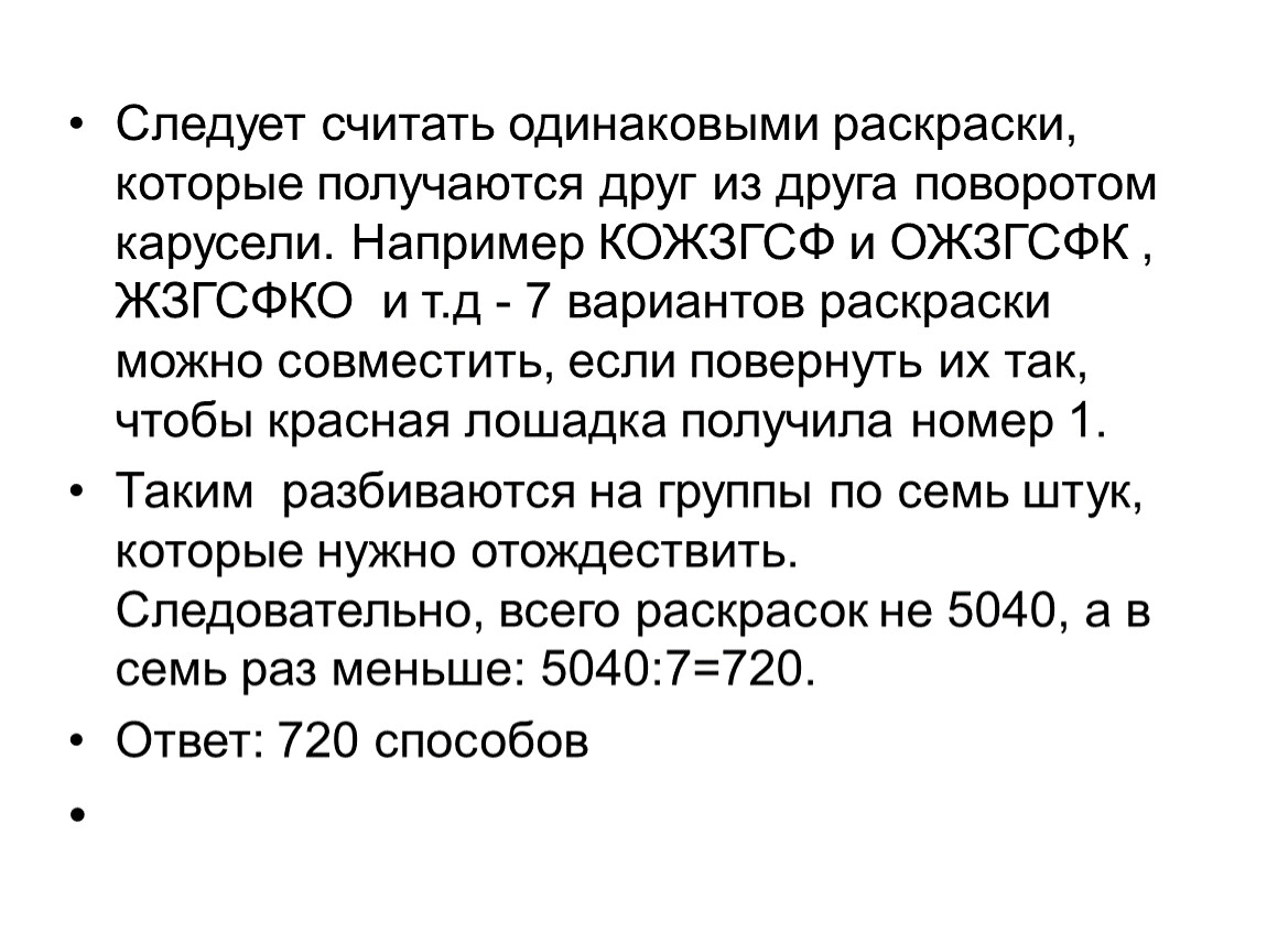 Следует считать одинаковыми раскраски, которые получаются друг из друга поворотом карусели. Например КОЖЗГСФ и ОЖЗГСФК , ЖЗГСФКО и т.д - 7 вариантов раскраски можно совместить, если повернуть их так, чтобы красная лошадка получила номер 1.