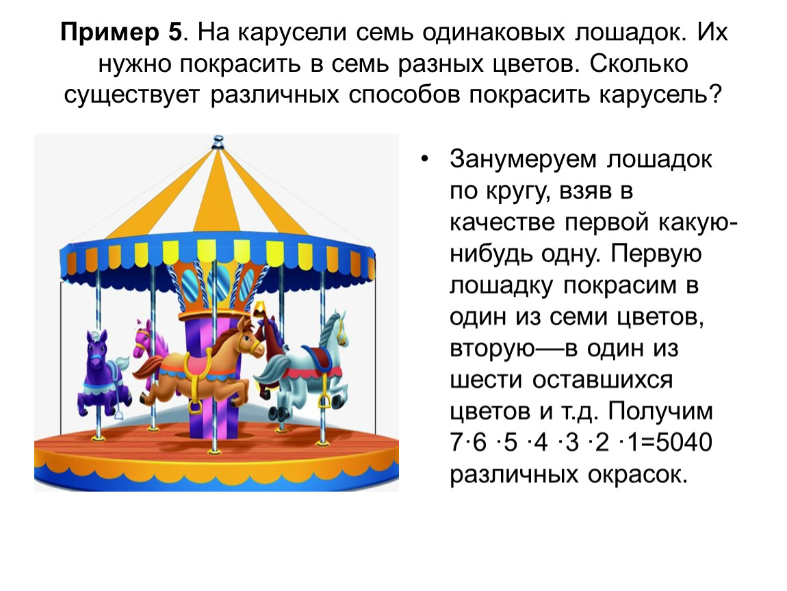 Пример 5. На карусели семь одинаковых лошадок. Их нужно покрасить в семь разных цветов. Сколько существует различных способов покрасить карусель?