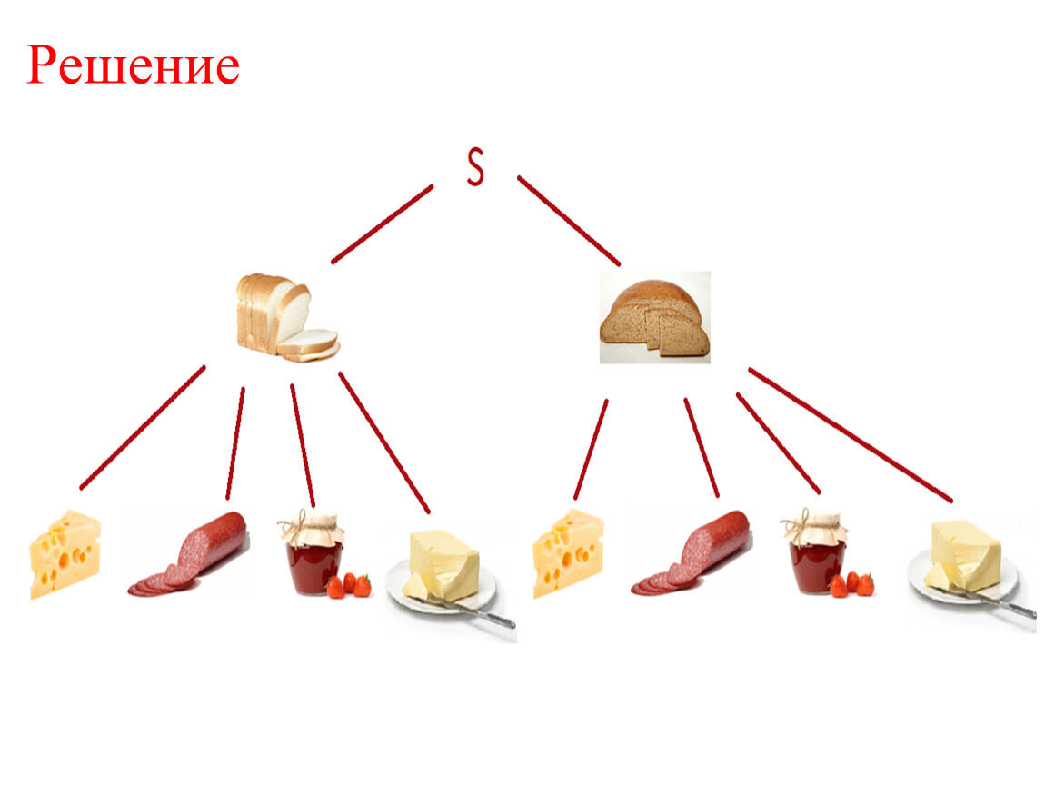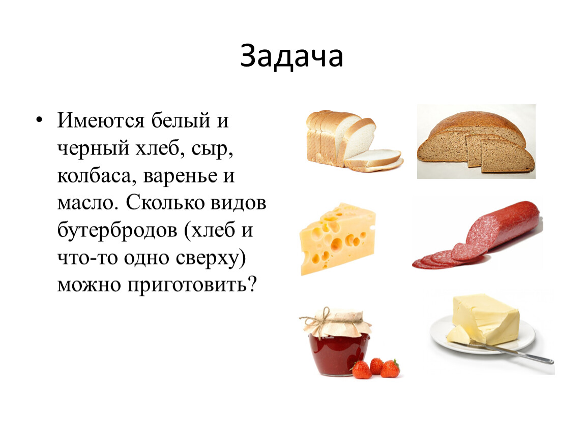 Имеются белый и черный хлеб, сыр, колбаса, варенье и масло. Сколько видов бутербродов (хлеб и что-то одно сверху) можно приготовить?