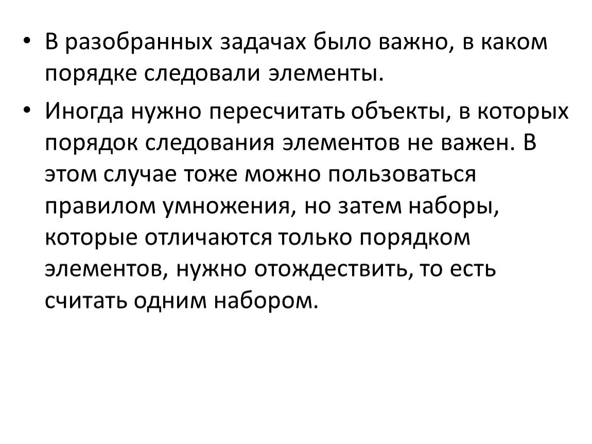 Иногда нужно пересчитать объекты, в которых порядок следования элементов не важен. В этом случае тоже можно пользоваться правилом умножения, но затем наборы, которые отличаются только порядком элементов, нужно отождествить, то есть считать одним набором.