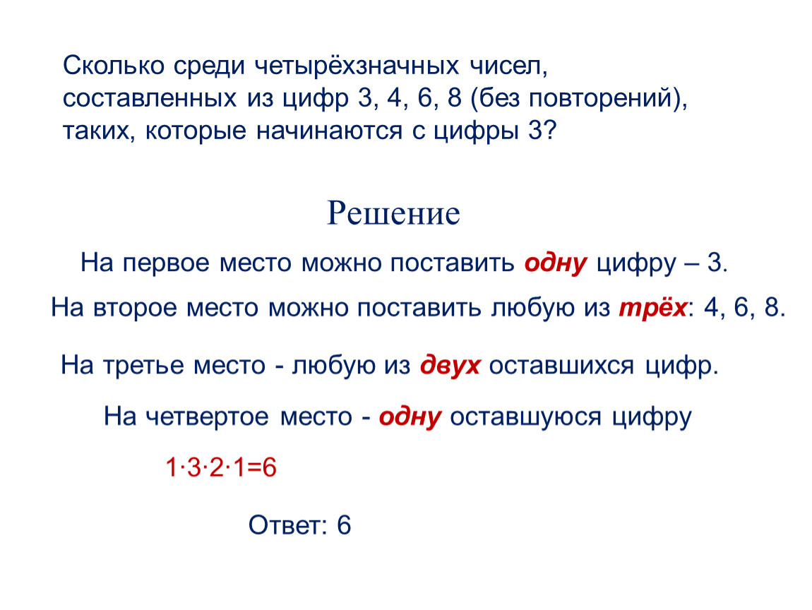 Сколько среди четырёхзначных чисел, составленных из цифр 3, 4, 6, 8 (без повторений), таких, которые начинаются с цифры 3?