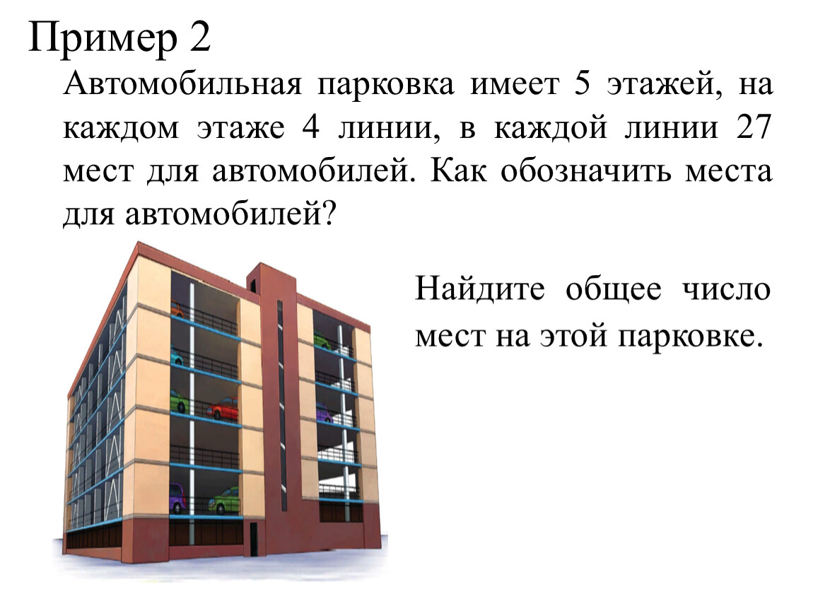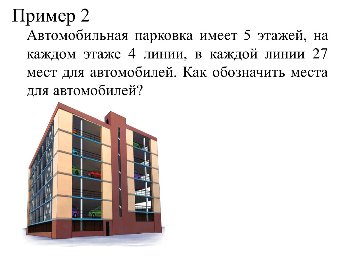 Автомобильная парковка имеет 5 этажей, на каждом этаже 4 линии, в каждой линии 27 мест для автомобилей. Как обозначить места для автомобилей?