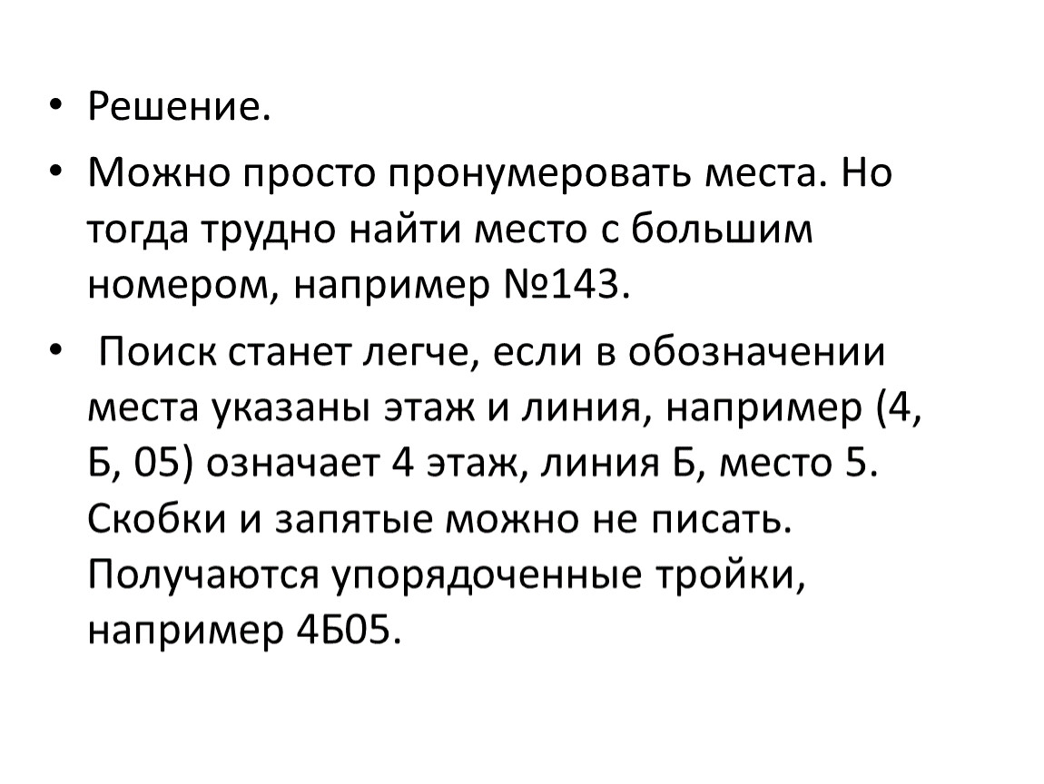 Поиск станет легче, если в обозначении места указаны этаж и линия, например (4, Б, 05) означает 4 этаж, линия Б, место 5. Скобки и запятые можно не писать. Получаются упорядоченные тройки, например 4Б05.