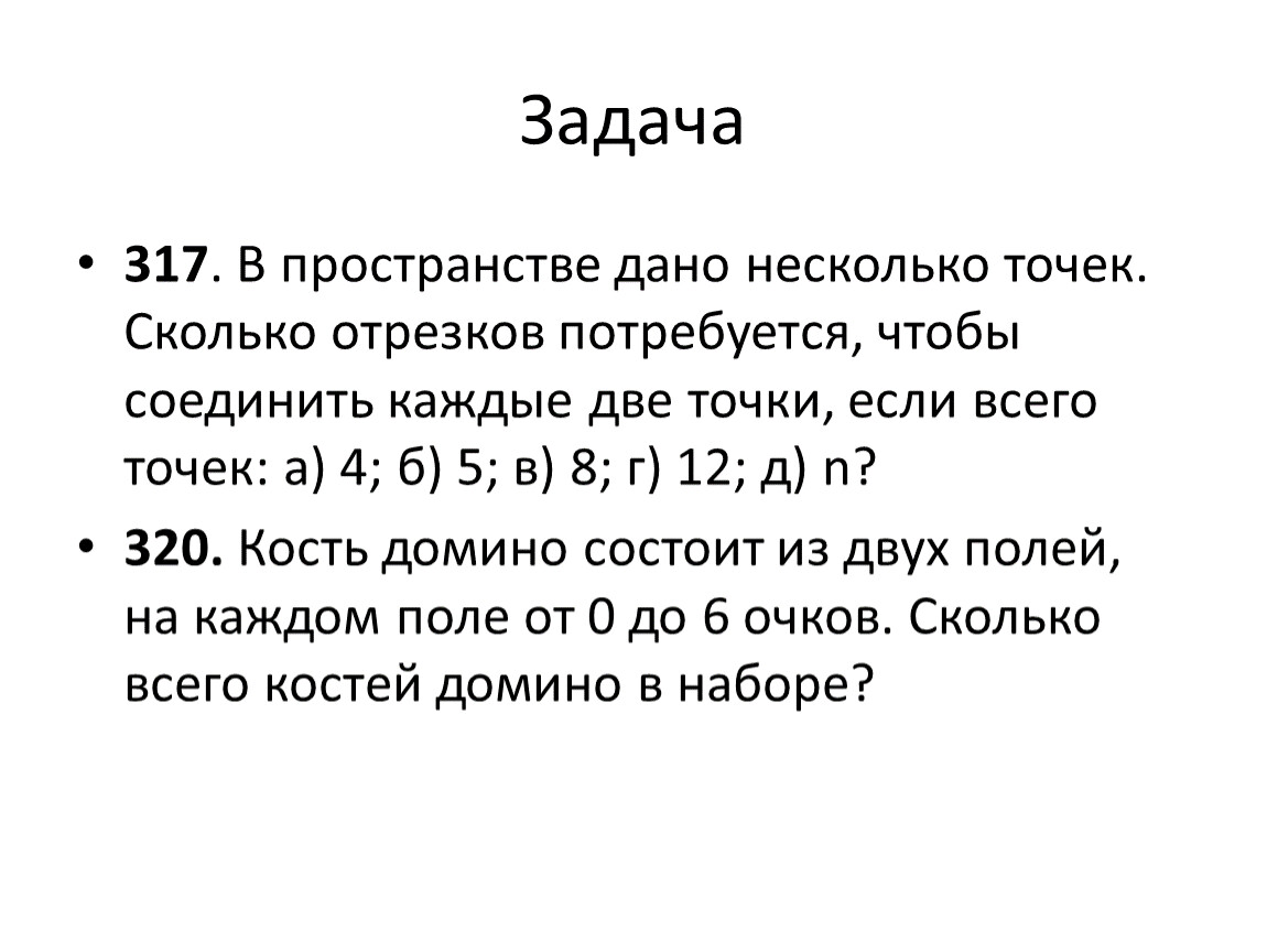 317. В пространстве дано несколько точек. Сколько отрезков потребуется, чтобы соединить каждые две точки, если всего точек: а) 4; б) 5; в) 8; г) 12; д) n?