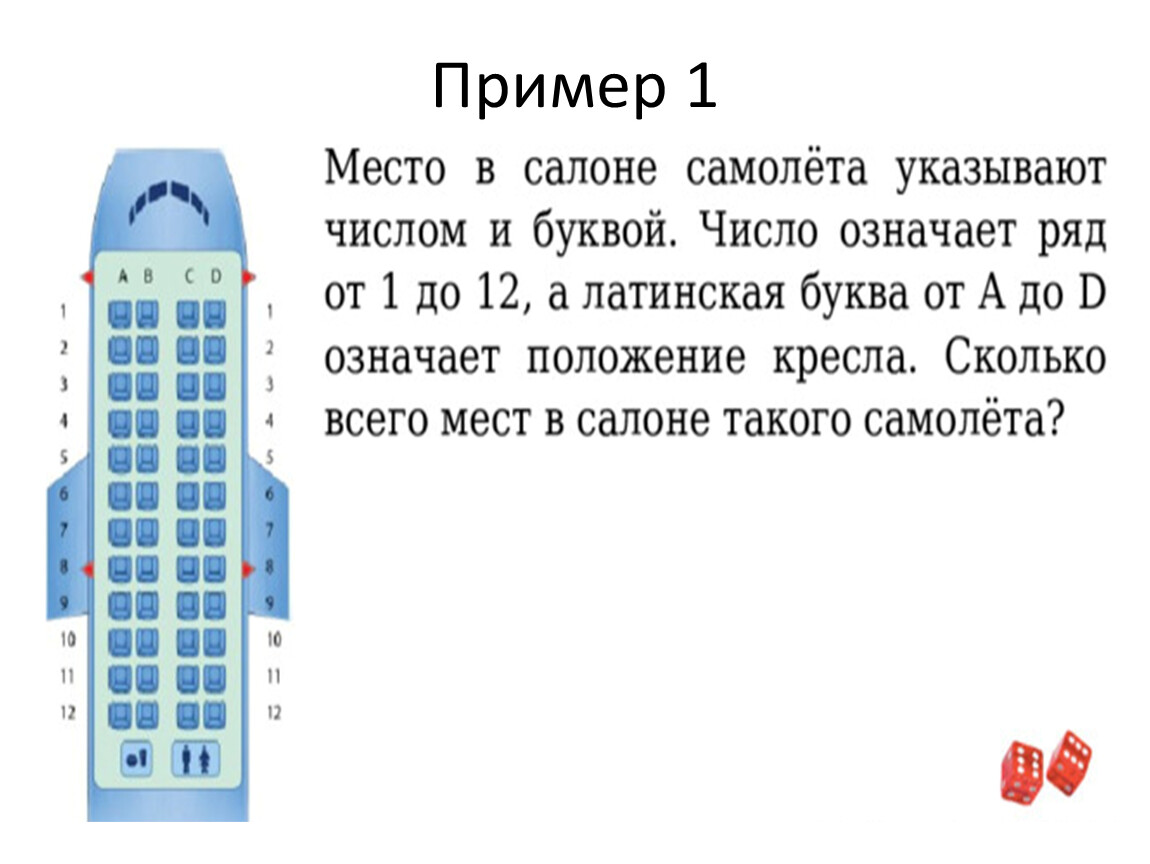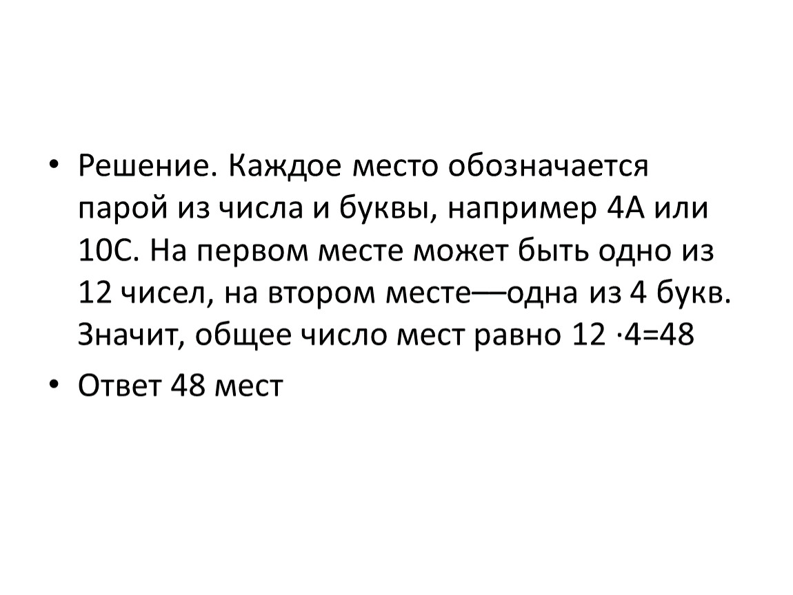 Решение. Каждое место обозначается парой из числа и буквы, например 4А или 10C. На первом месте может быть одно из 12 чисел, на втором месте––одна из 4 букв. Значит, общее число мест равно 12 ·4=48