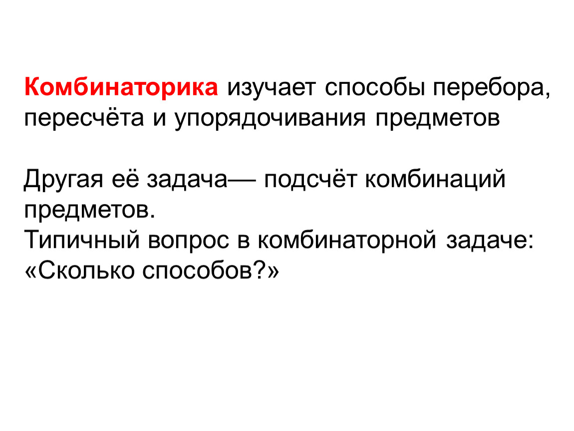 Комбинаторика изучает способы перебора, пересчёта и упорядочивания предметов