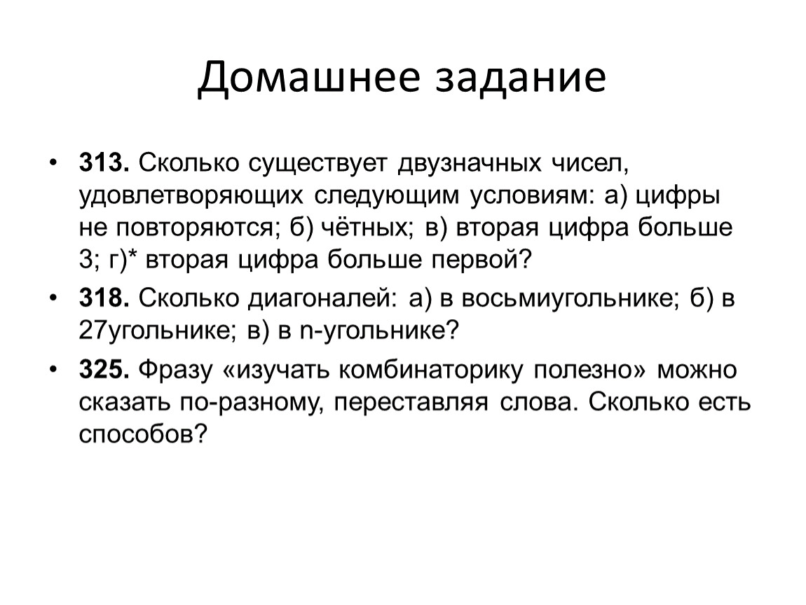 325. Фразу «изучать комбинаторику полезно» можно сказать по-разному, переставляя слова. Сколько есть способов?