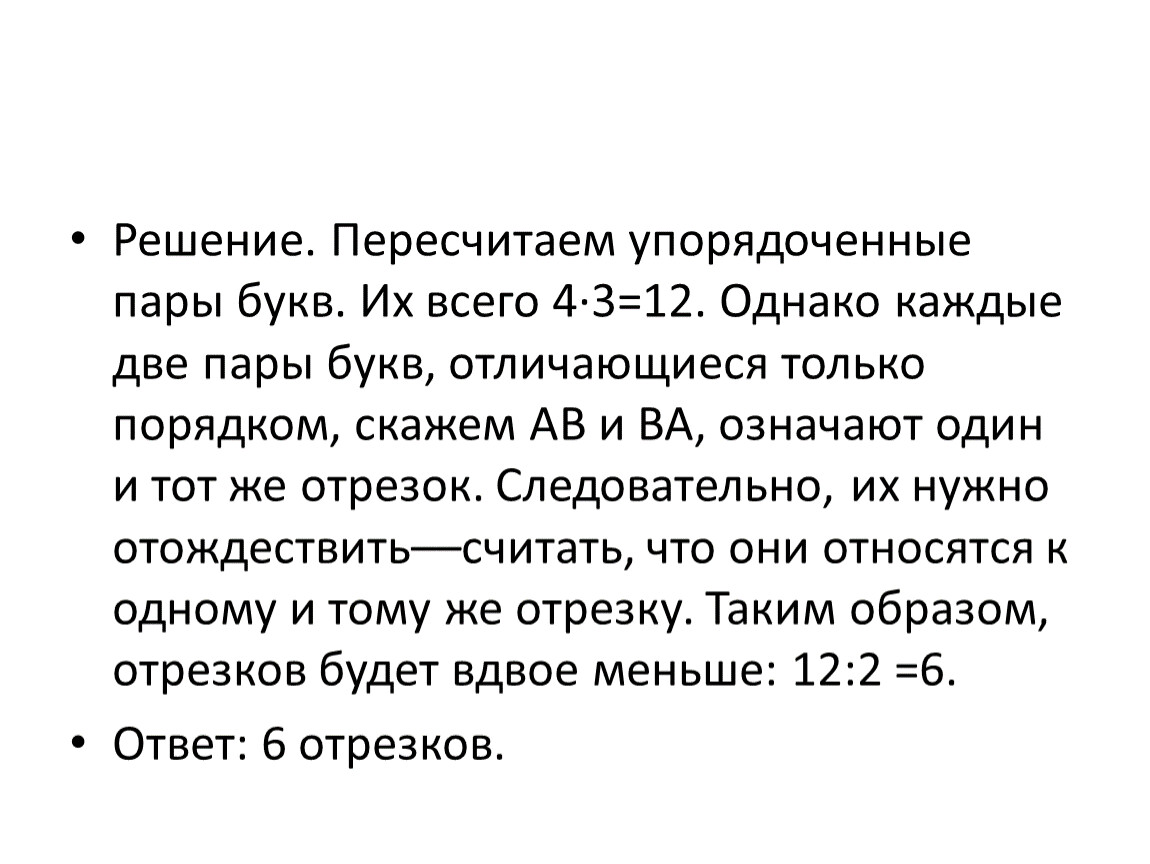 Решение. Пересчитаем упорядоченные пары букв. Их всего 4·3=12. Однако каждые две пары букв, отличающиеся только порядком, скажем AB и BA, означают один и тот же отрезок. Следовательно, их нужно отождествить––считать, что они относятся к одному и тому же отрезку. Таким образом, отрезков будет вдвое меньше: 12:2 =6.