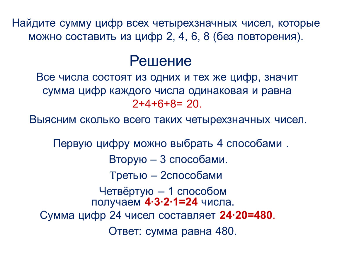 Найдите сумму цифр всех четырехзначных чисел, которые можно составить из цифр 2, 4, 6, 8 (без повторения).