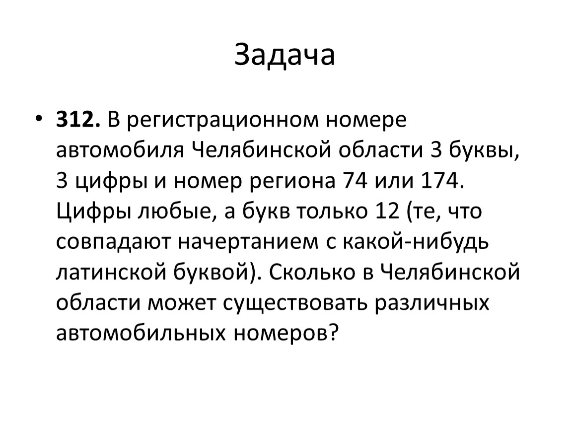312. В регистрационном номере автомобиля Челябинской области 3 буквы, 3 цифры и номер региона 74 или 174. Цифры любые, а букв только 12 (те, что совпадают начертанием с какой-нибудь латинской буквой). Сколько в Челябинской области может существовать различных автомобильных номеров?