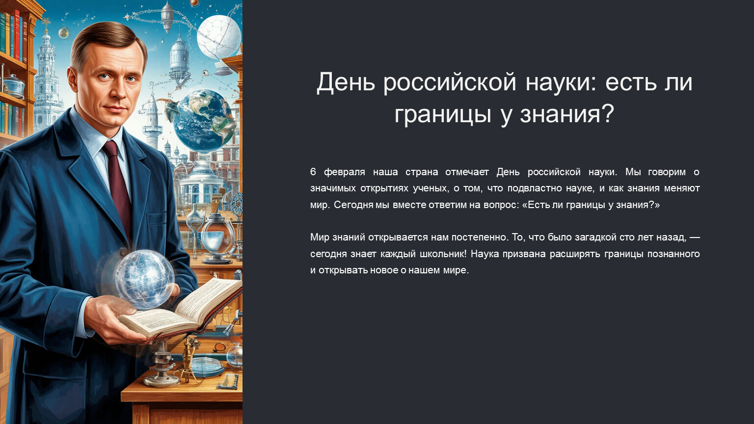 6 февраля наша страна отмечает День российской науки. Мы говорим о значимых открытиях ученых, о том, что подвластно науке, и как знания меняют мир. Сегодня мы вместе ответим на вопрос: «Есть ли границы у знания?»