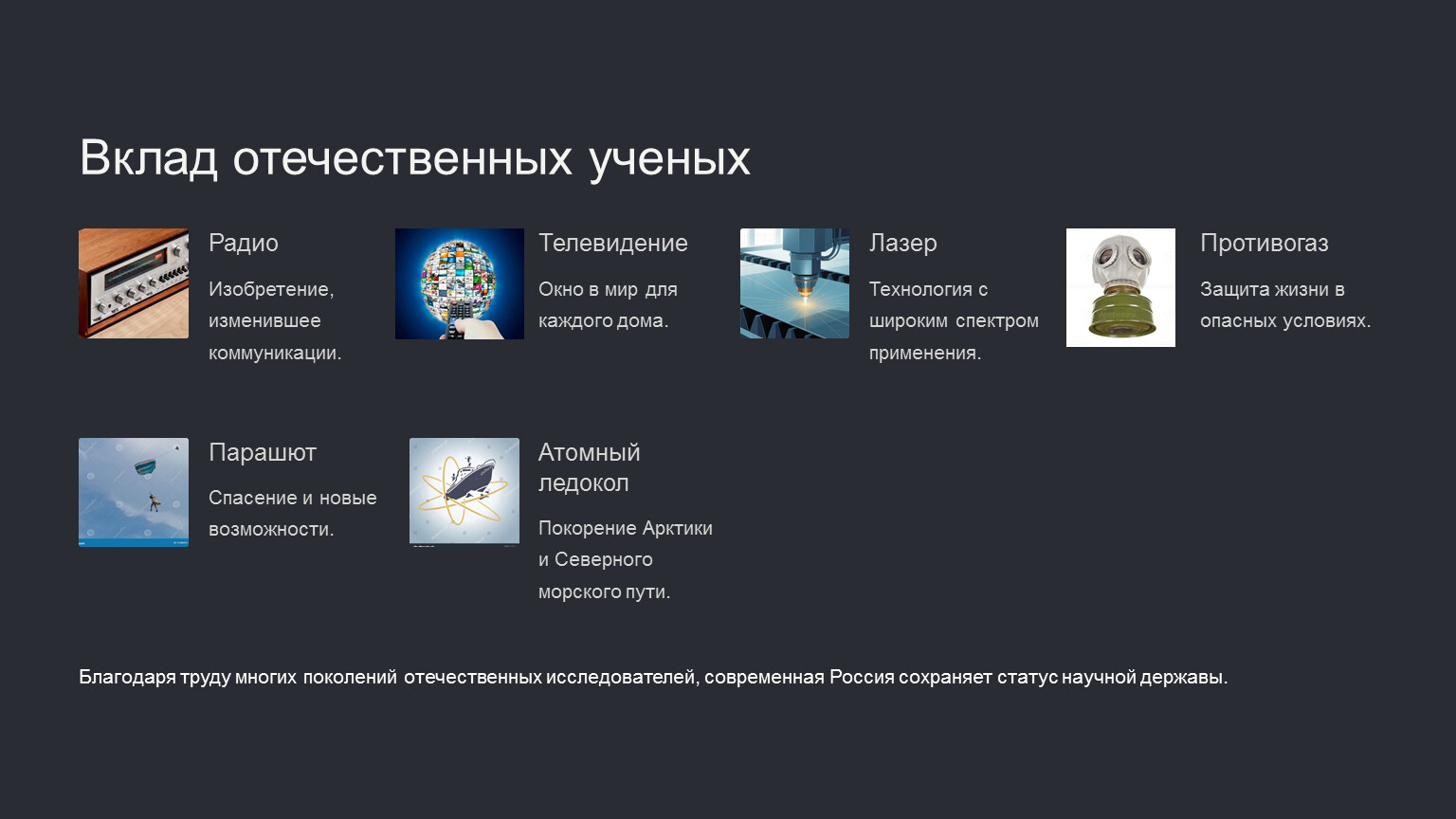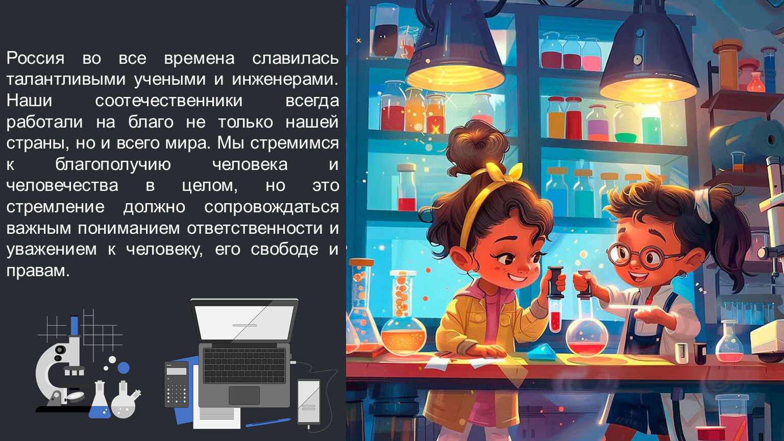 Россия во все времена славилась талантливыми учеными и инженерами. Наши соотечественники всегда работали на благо не только нашей страны, но и всего мира. Мы стремимся к благополучию человека и человечества в целом, но это стремление должно сопровождаться важным пониманием ответственности и уважением к человеку, его свободе и правам.