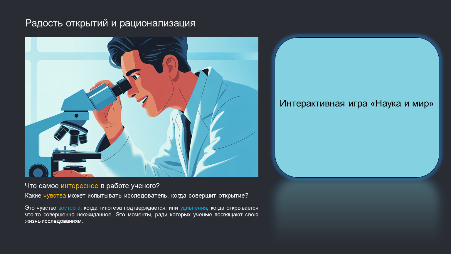 Это чувство восторга, когда гипотеза подтверждается, или удивления, когда открывается что-то совершенно неожиданное. Это моменты, ради которых ученые посвящают свою жизнь исследованиям.