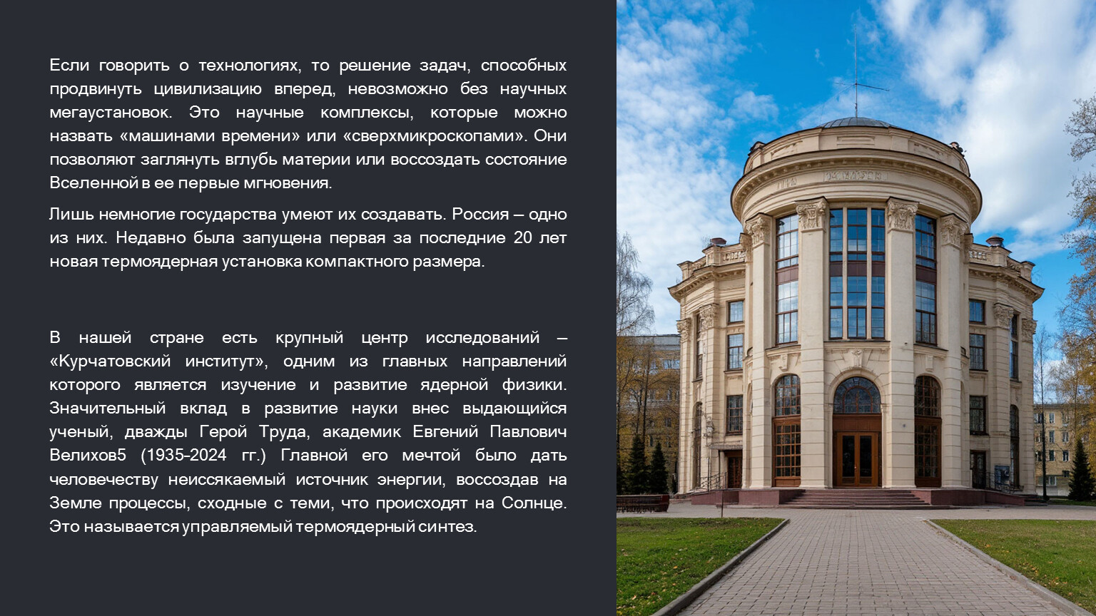 В нашей стране есть крупный центр исследований — «Курчатовский институт», одним из главных направлений которого является изучение и развитие ядерной физики. Значительный вклад в развитие науки внес выдающийся ученый, дважды Герой Труда, академик Евгений Павлович Велихов5 (1935–2024 гг.) Главной его мечтой было дать человечеству неиссякаемый источник энергии, воссоздав на Земле процессы, сходные с теми, что происходят на Солнце. Это называется управляемый термоядерный синтез.