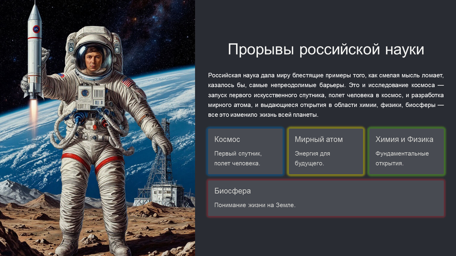 Российская наука дала миру блестящие примеры того, как смелая мысль ломает, казалось бы, самые непреодолимые барьеры. Это и исследование космоса — запуск первого искусственного спутника, полет человека в космос, и разработка мирного атома, и выдающиеся открытия в области химии, физики, биосферы — все это изменило жизнь всей планеты.