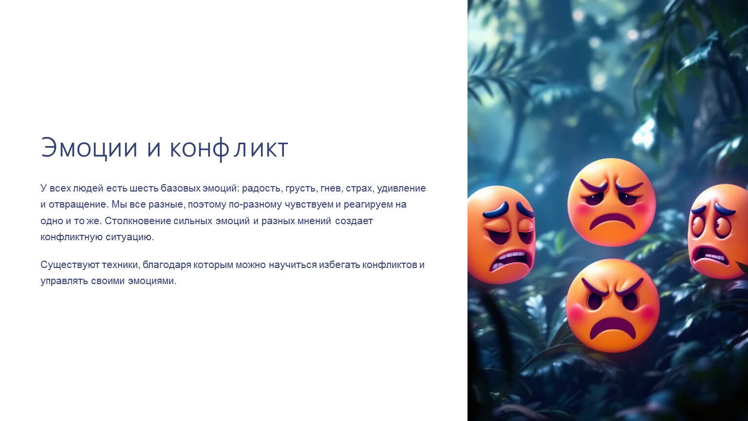 У всех людей есть шесть базовых эмоций: радость, грусть, гнев, страх, удивление и отвращение. Мы все разные, поэтому по-разному чувствуем и реагируем на одно и то же. Столкновение сильных эмоций и разных мнений создает конфликтную ситуацию.