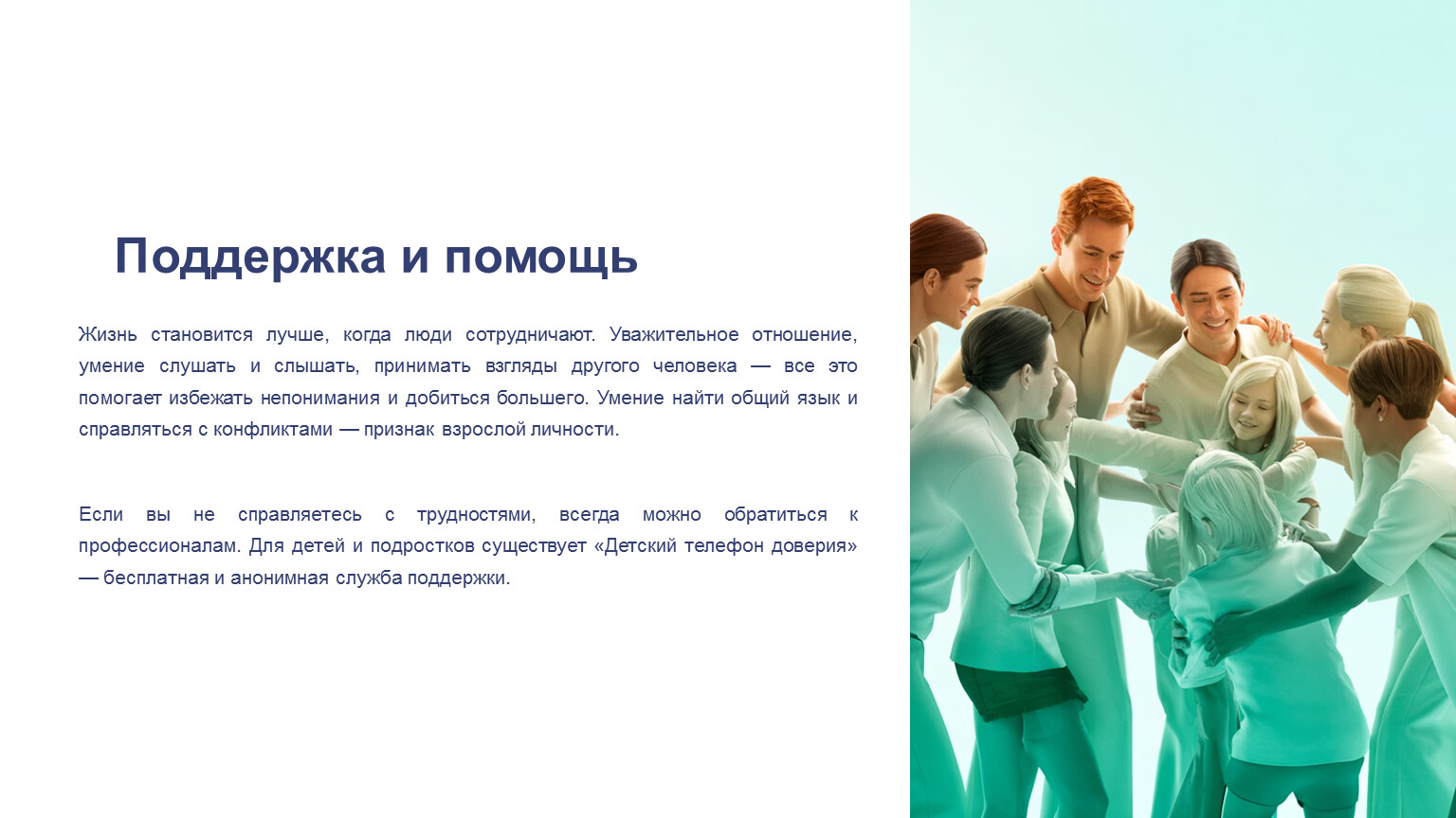 Жизнь становится лучше, когда люди сотрудничают. Уважительное отношение, умение слушать и слышать, принимать взгляды другого человека — все это помогает избежать непонимания и добиться большего. Умение найти общий язык и справляться с конфликтами — признак взрослой личности.