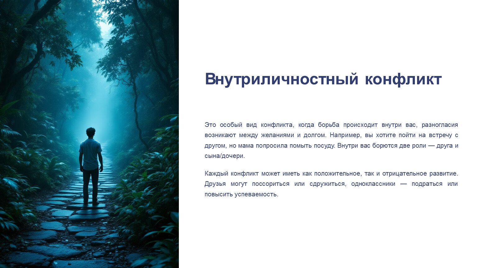 Это особый вид конфликта, когда борьба происходит внутри вас, разногласия возникают между желаниями и долгом. Например, вы хотите пойти на встречу с другом, но мама попросила помыть посуду. Внутри вас борются две роли — друга и сына/дочери.