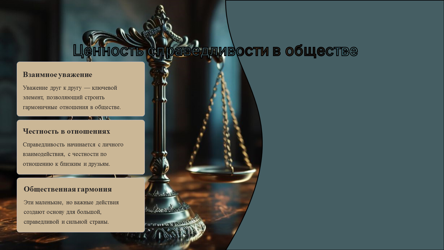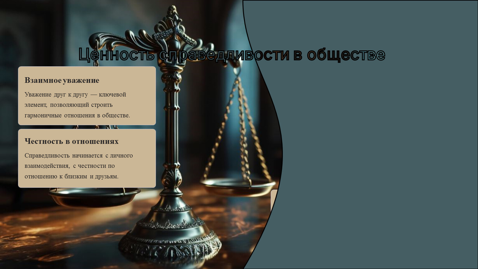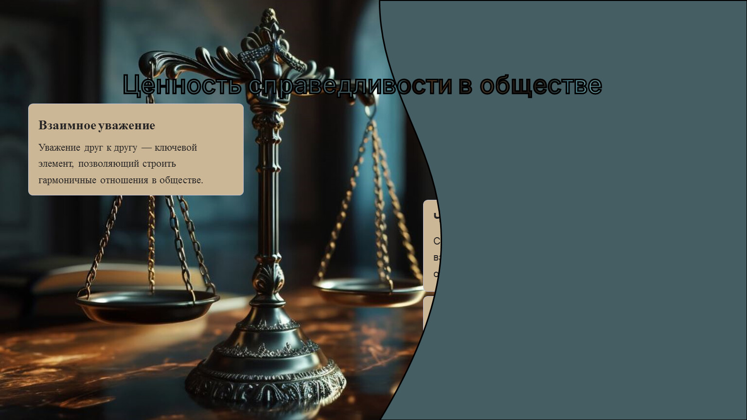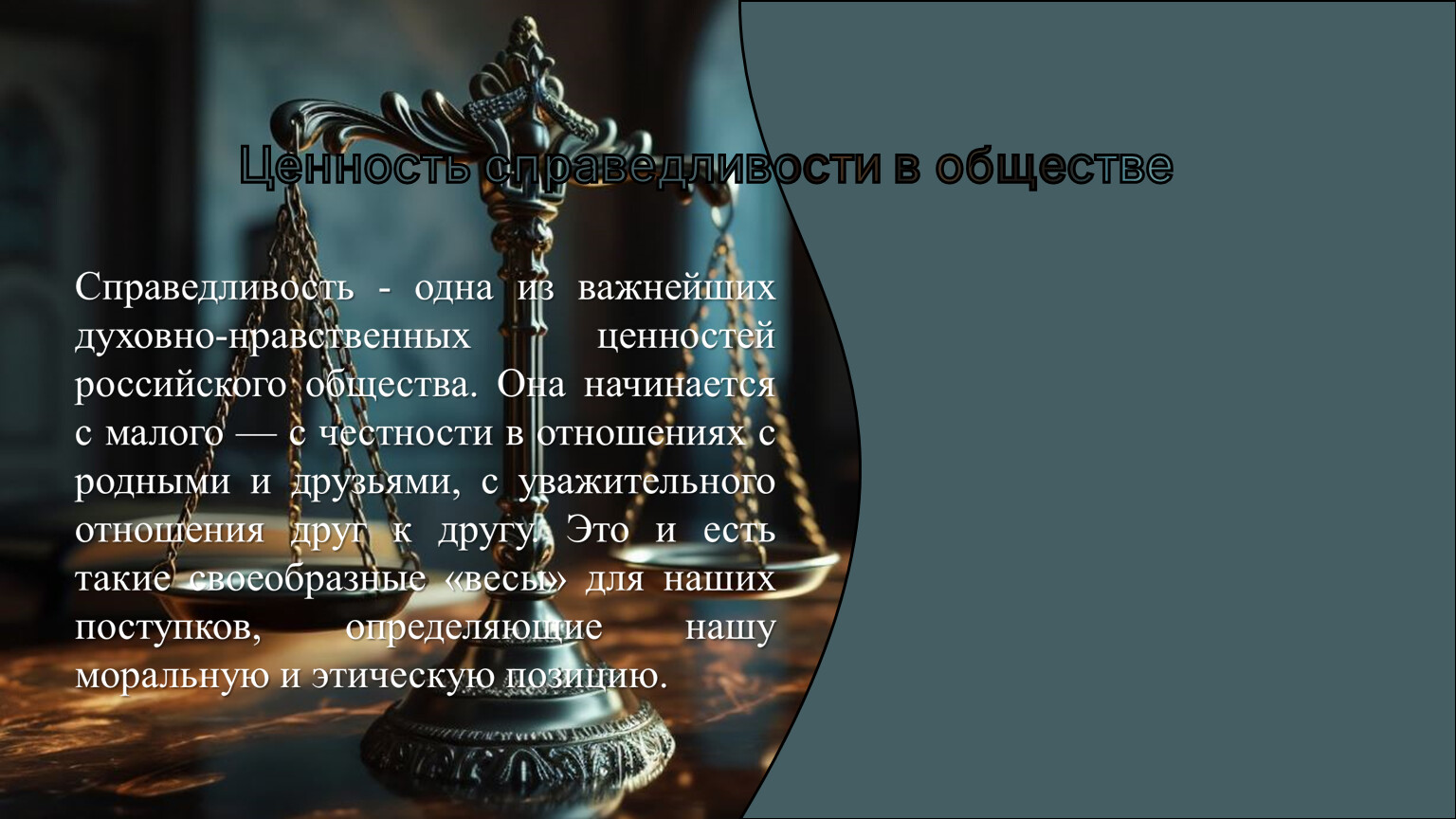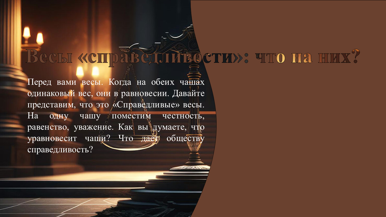 Перед вами весы. Когда на обеих чашах одинаковый вес, они в равновесии. Давайте представим, что это «Справедливые» весы. На одну чашу поместим честность, равенство, уважение. Как вы думаете, что уравновесит чаши? Что дает обществу справедливость?