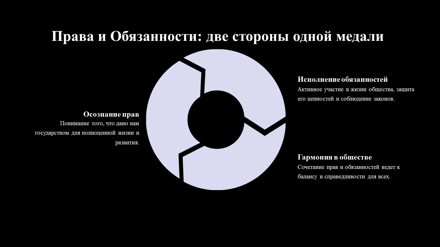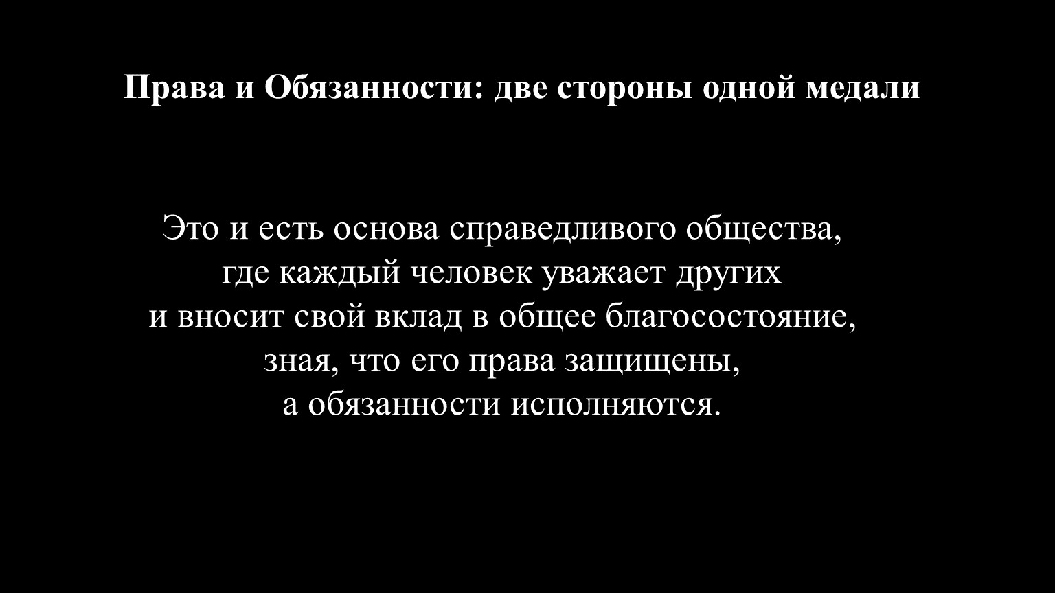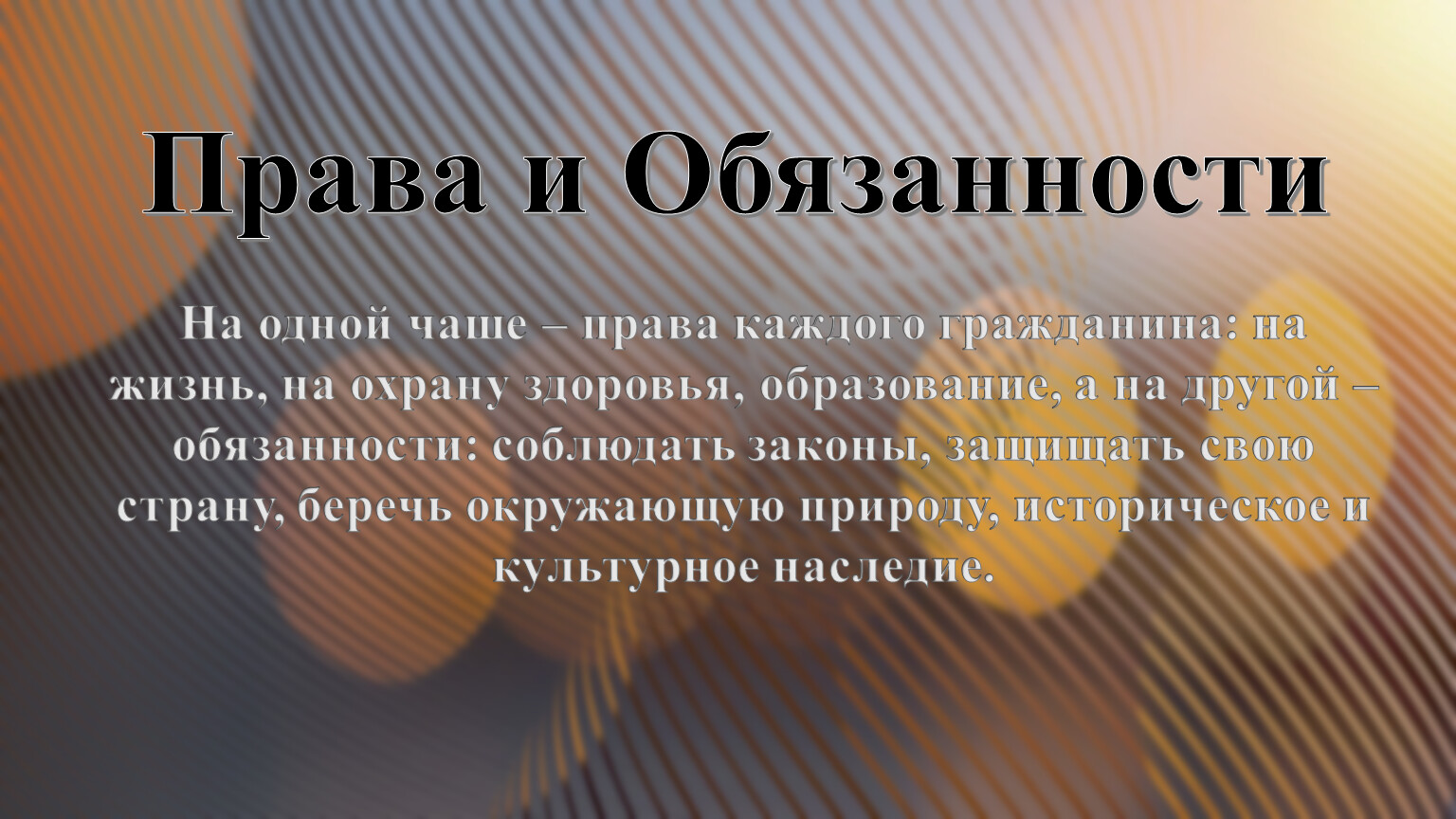 На одной чаше – права каждого гражданина: на жизнь, на охрану здоровья, образование, а на другой – обязанности: соблюдать законы, защищать свою страну, беречь окружающую природу, историческое и культурное наследие.