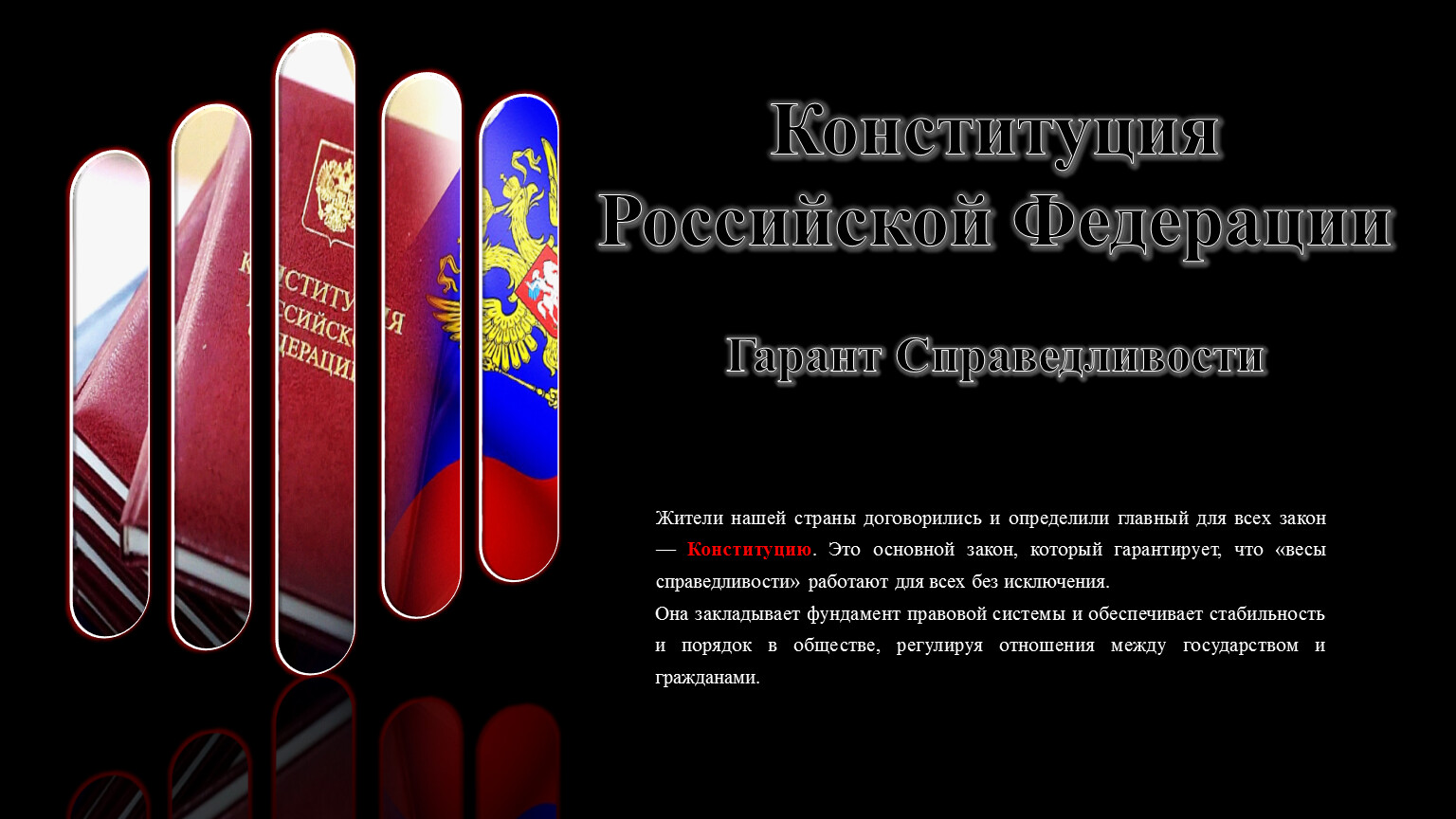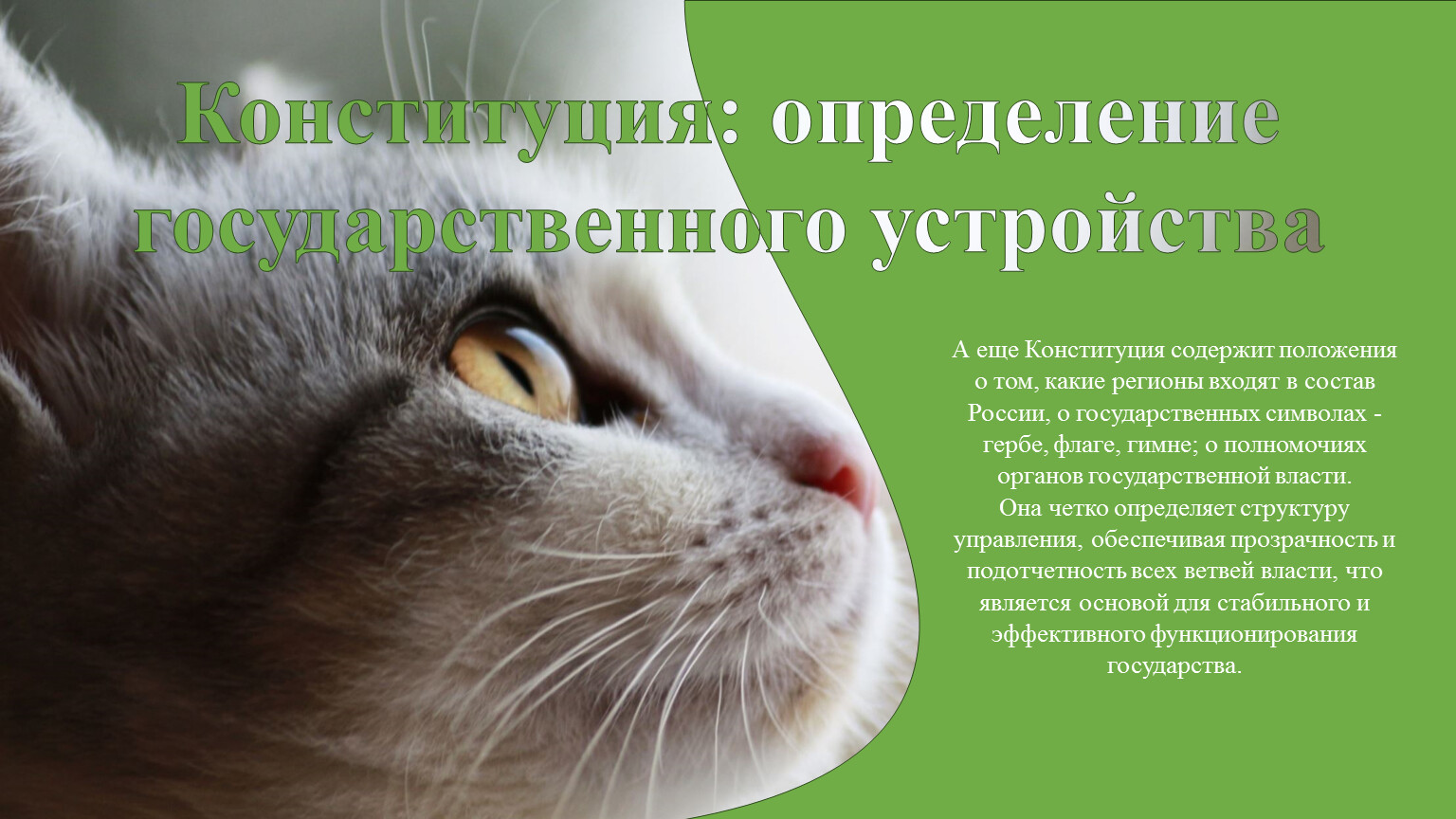 А еще Конституция содержит положения о том, какие регионы входят в состав России, о государственных символах - гербе, флаге, гимне; о полномочиях органов государственной власти.