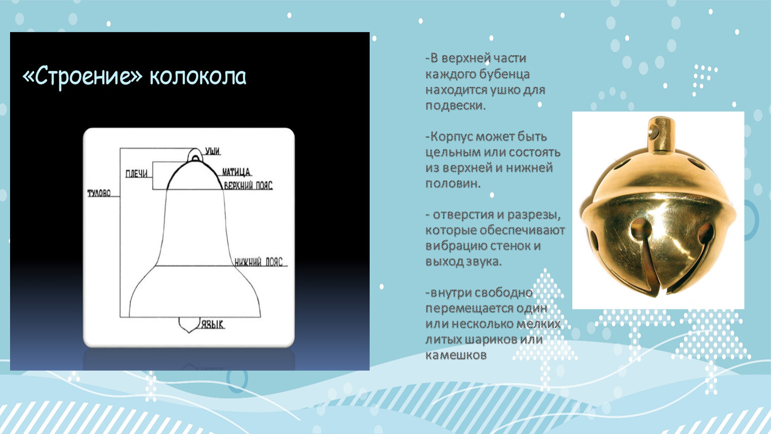 -В верхней части каждого бубенца находится ушко для подвески.-Корпус может быть цельным или состоять из верхней и нижней половин. - отверстия и разрезы, которые обеспечивают вибрацию стенок и выход звука.-внутри свободно перемещается один или несколько мелких литых шариков или камешков