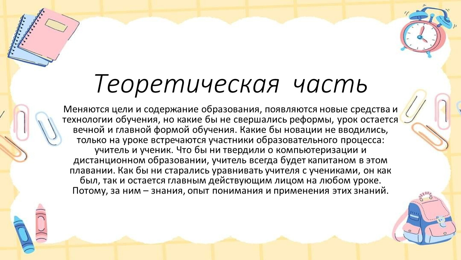 Меняются цели и содержание образования, появляются новые средства и технологии обучения, но какие бы не свершались реформы, урок остается вечной и главной формой обучения. Какие бы новации не вводились, только на уроке встречаются участники образовательного процесса: учитель и ученик. Что бы ни твердили о компьютеризации и дистанционном образовании, учитель всегда будет капитаном в этом плавании. Как бы ни старались уравнивать учителя с учениками, он как был, так и остается главным действующим лицом на любом уроке. Потому, за ним – знания, опыт понимания и применения этих знаний.