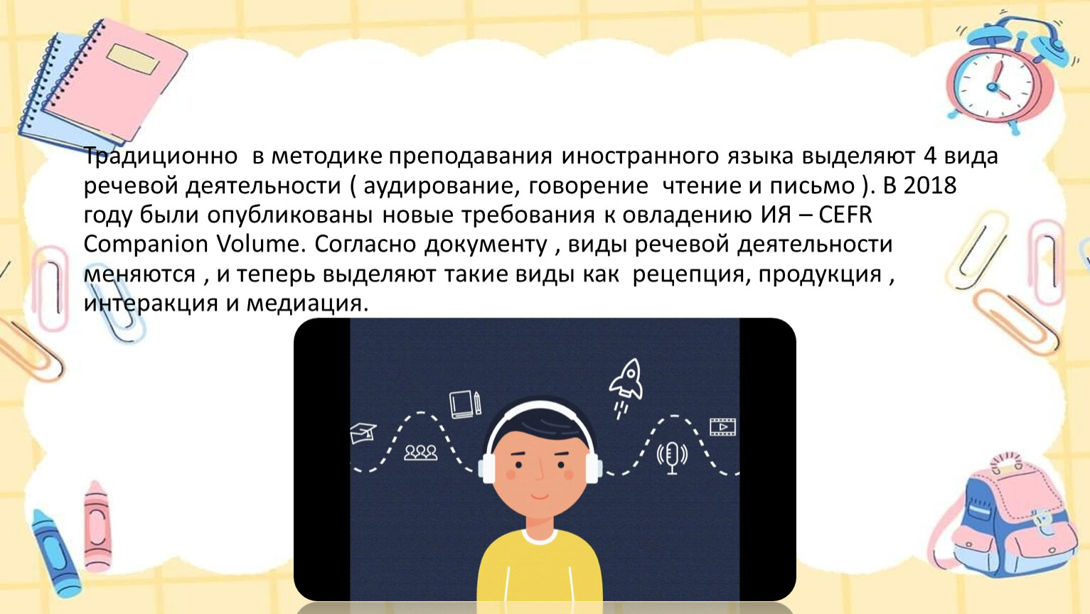 Традиционно в методике преподавания иностранного языка выделяют 4 вида речевой деятельности ( аудирование, говорение чтение и письмо ). В 2018 году были опубликованы новые требования к овладению ИЯ – CEFR Companion Volume. Согласно документу , виды речевой деятельности меняются , и теперь выделяют такие виды как рецепция, продукция , интеракция и медиация.