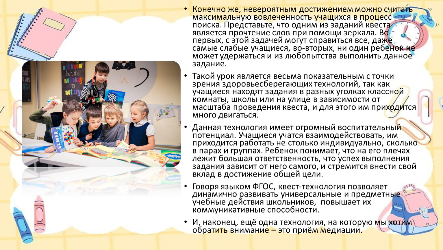 Конечно же, невероятным достижением можно считать максимальную вовлеченность учащихся в процесс поиска. Представьте, что одним из заданий квеста является прочтение слов при помощи зеркала. Во-первых, с этой задачей могут справиться все, даже самые слабые учащиеся, во-вторых, ни один ребенок не может удержаться и из любопытства выполнить данное задание.